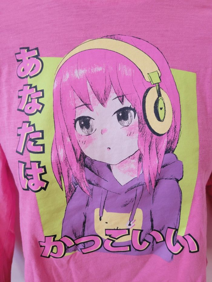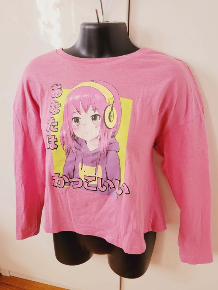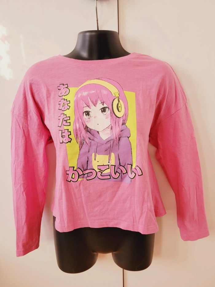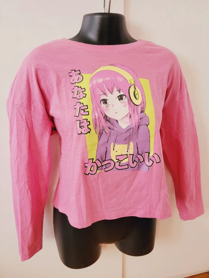Tee shirt imprimé manga anime girl rose manches 3/4 taille XS 34 en 100% coton coquette - photo numéro 1