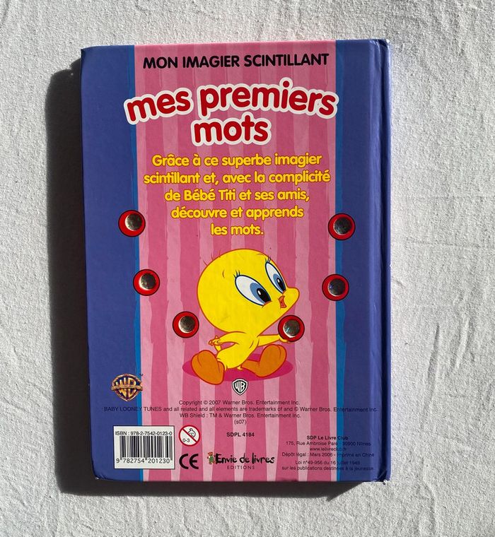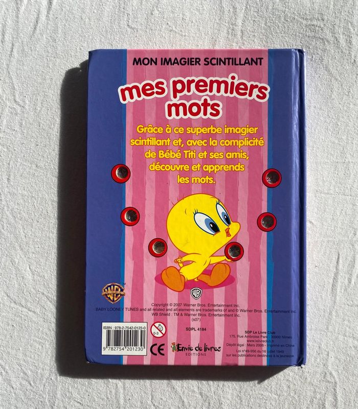 📚#dirly_livresenfants📚 Mes premiers mots : Grâce à ce superbe imagier scintillant et, avec la complicité de Bébé Titi et ses amis, découvre et apprends les mots. || Collection : "Mon imagier scintillant - Baby Looney Tunes" || Editions : Envies de Livres 🫧BE (Bon État) : pas de déchirure, pas de dessins à l’intérieur, beaucoup lu => coins abîmés et un petit nettoyage est nécessaire (voir photos) Mixte fille 👧 / garçon 👦 N’hésitez pas à aller voir mon dressing 📚 🩴👟🎲 👕👖pour profiter de prix intéressants. 〰️Maison non fumeur 🚭 〰️Pas d’animaux 👉 les # (voir au début de l’annonce) vous permettent d'accéder directement aux tailles ou categories recherchées (retirez les filtres de taille tout en haut de la recherche) 😊 👉Réduction ↘️ si plusieurs achats 🛍️🛍️ 👉Abonnez-vous à mon profil, d’autres articles sont en cours de publication 😊 👉Envoi très rapide 🏎️ 🚛 📦 #livre #vintage #collectionneur #retro #cadeau #gift