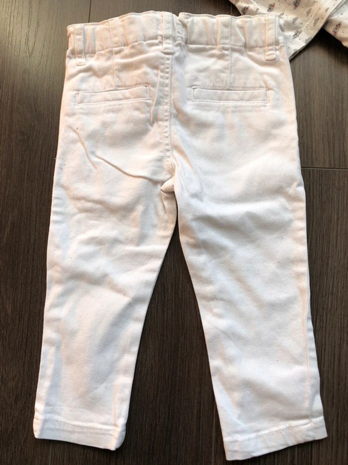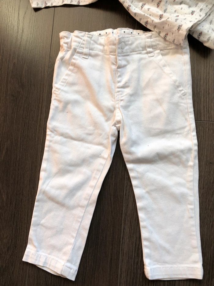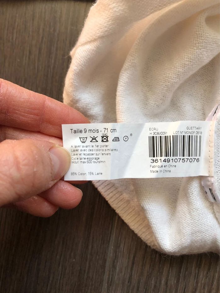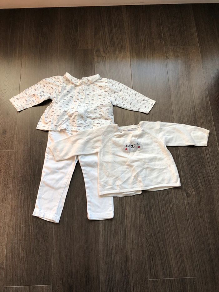 En très bon état. Le jeans est ajustable à la taille avec deux élastiques. Il a une petite tache. Taille un peu grand. Le haut a un col claudine et est en excellent état. Le pull contient de la laine, mais reste léger pour le printemps. Taille 9 mois, grand. #nuria_2924_12mois #boutchou12mois #ensemblefille12mois #conjuntobebeniña