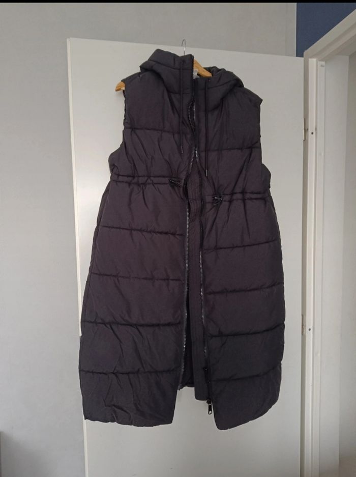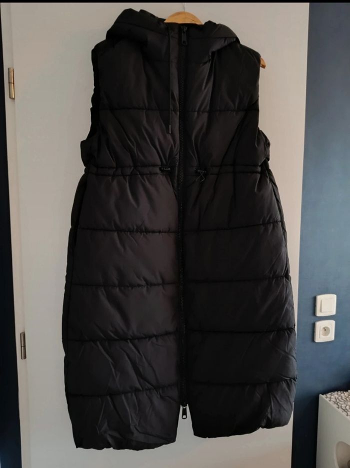 Doudoune a capuche sans manche de grossesse taille M ,avec poche . Longueur 94,5 cm Lien des serrages a la taille .très bon état