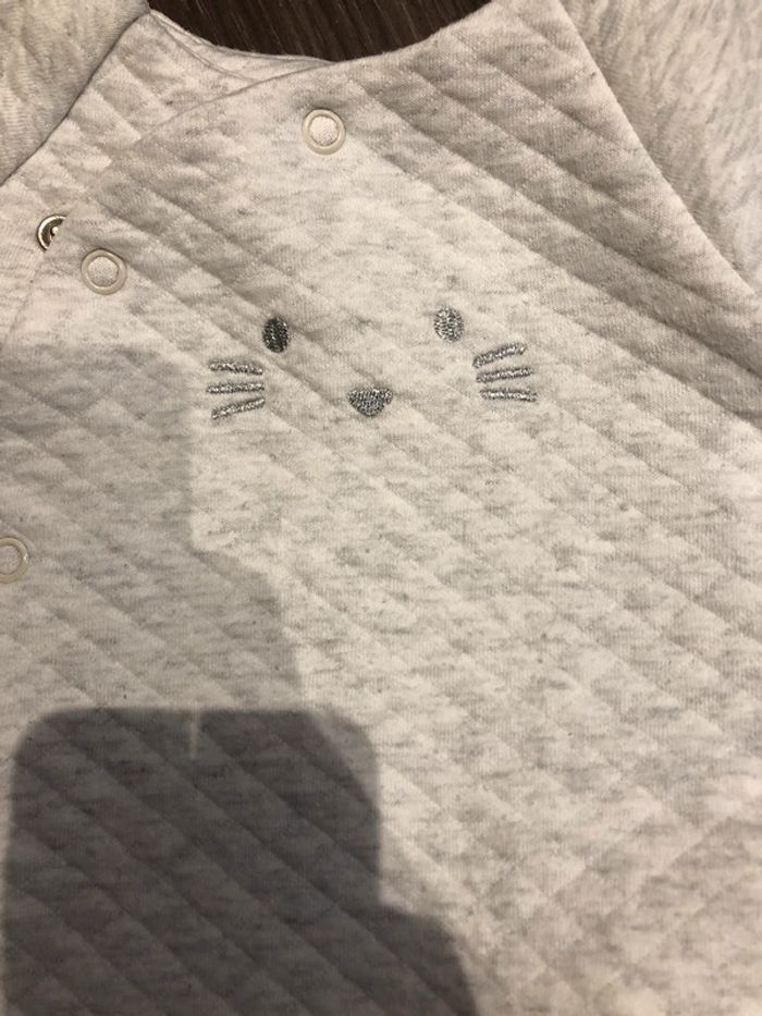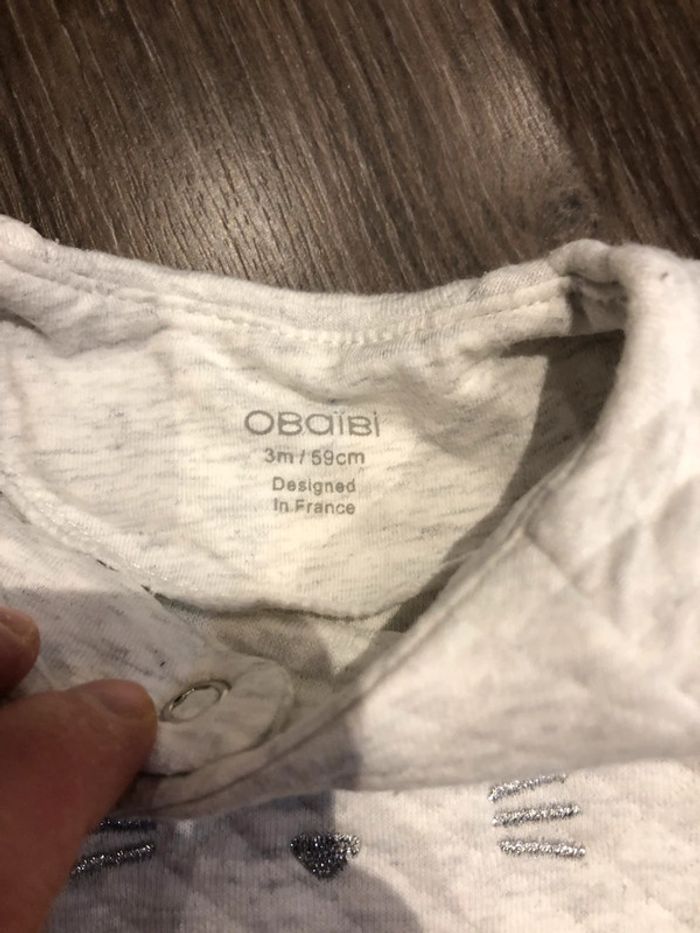 Combinaison molletonnée de la marque Obaïbi. Taille 3 mois (59 cm). Couleur gris clair. Ouverture avec boutons pression. En très bon état. #nuria_2924_1mois #nuria_2924_3mois