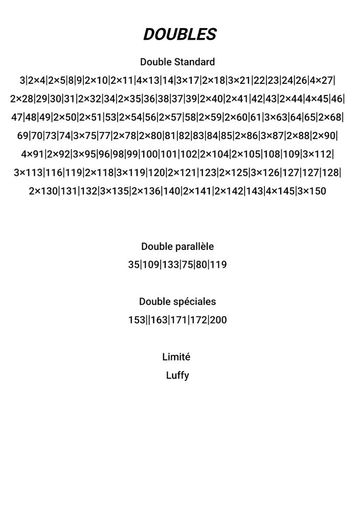 carte one piece 25e anniversaire Échange ou vend Lot ou unité Carte standard: 0,50€ Carte parallèle: 1,00€ Carte spéciale: 2,00€ Carte limitée: 3,00€ ⚠️Ne pas acheter l'annonce contacter moi⚠️