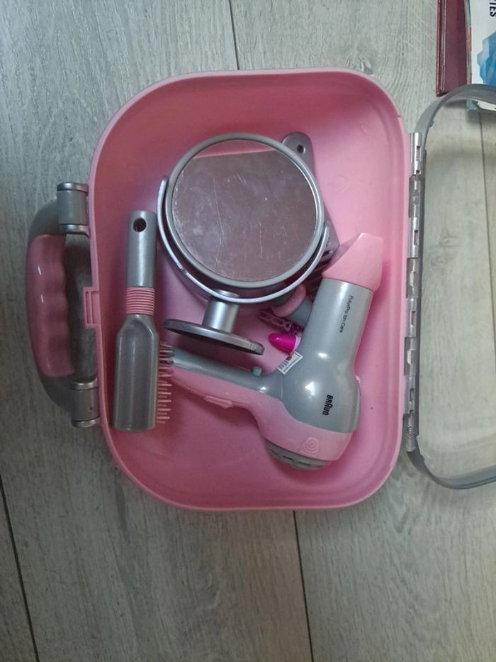 Valisette de coiffure Braun Vendue avec sèche cheveux, miroir, brosse et accessoires sur la photo. Bon état. Attention le sèche cheveux ne fait plus de bruit. #vayssadejouet