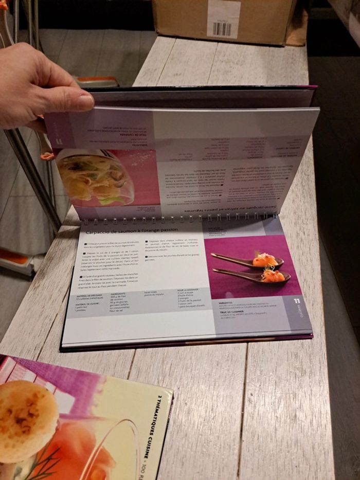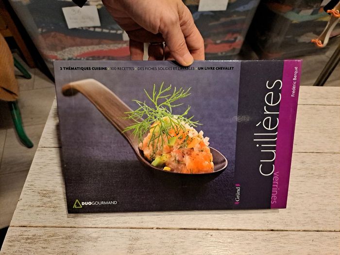 Un livre de cuisine dans un coffret. Une partie sur la cuisine avec verrines et une autre partie sur la cuisine avec cuillères Neuf jamais servi. Une pliure d'origine sur le coffret (photo) Idée cadeau Noël #vayssadelivres