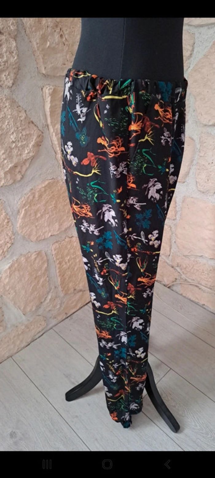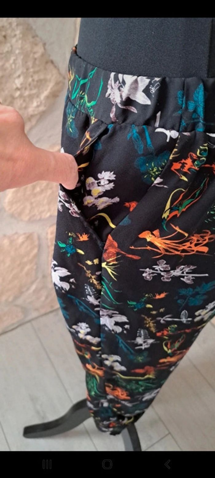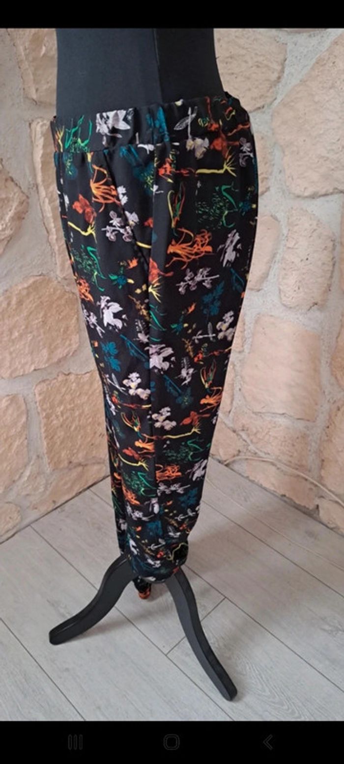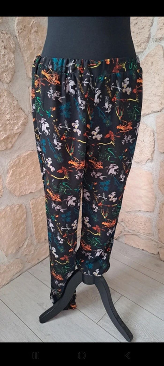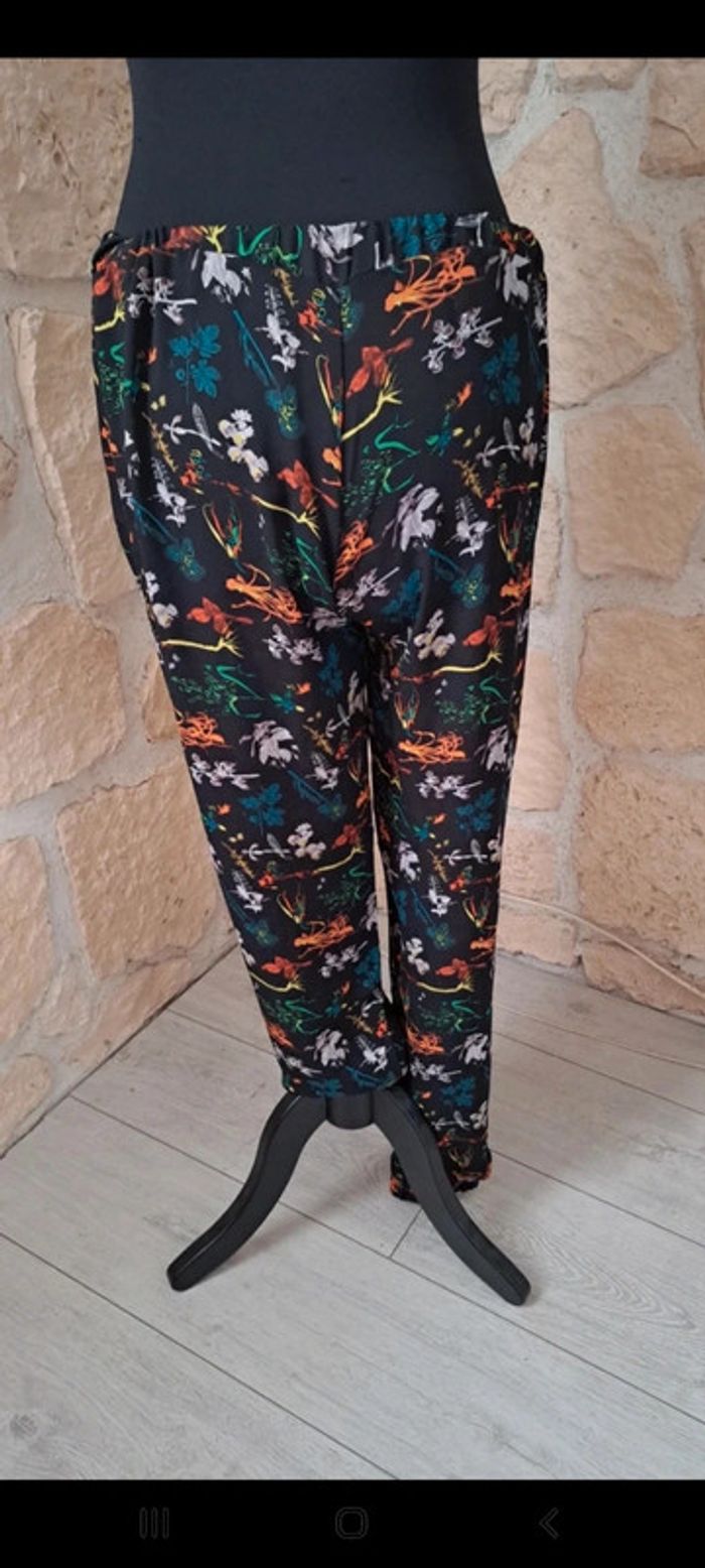 Pantalon fluide femme Naf Naf taille L Très bon état. Élastique aux chevilles. Élastique à la taille. A noter que l'élastique a un peu tourné. Motif tropical fleurs Deux poches sur les côtés #vayssadefemme40