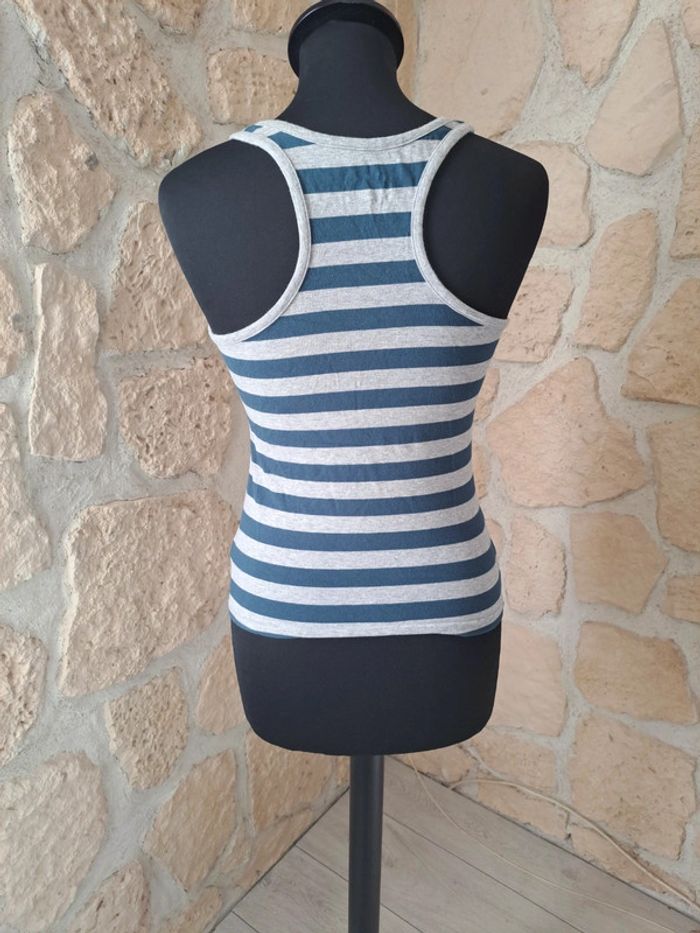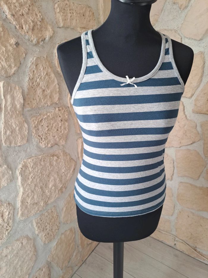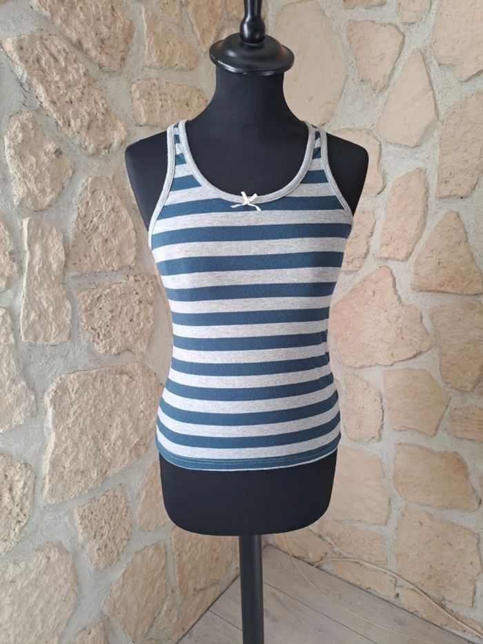 Débardeur femme taille M tex en excellent état. Sport team club. Dos nageur Porté 1 fois Couleurs bleu marine et gris. Petit noeud devant. #vayssadefemme38