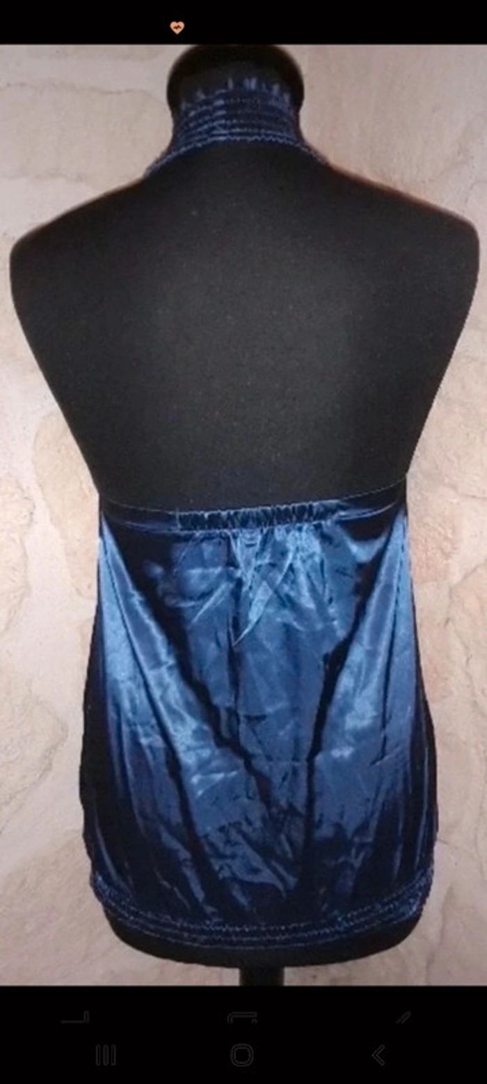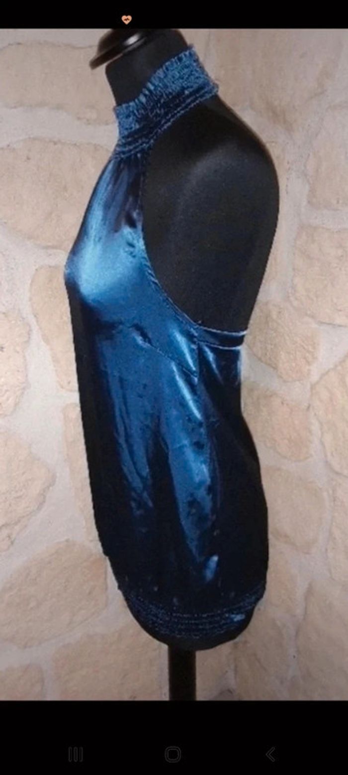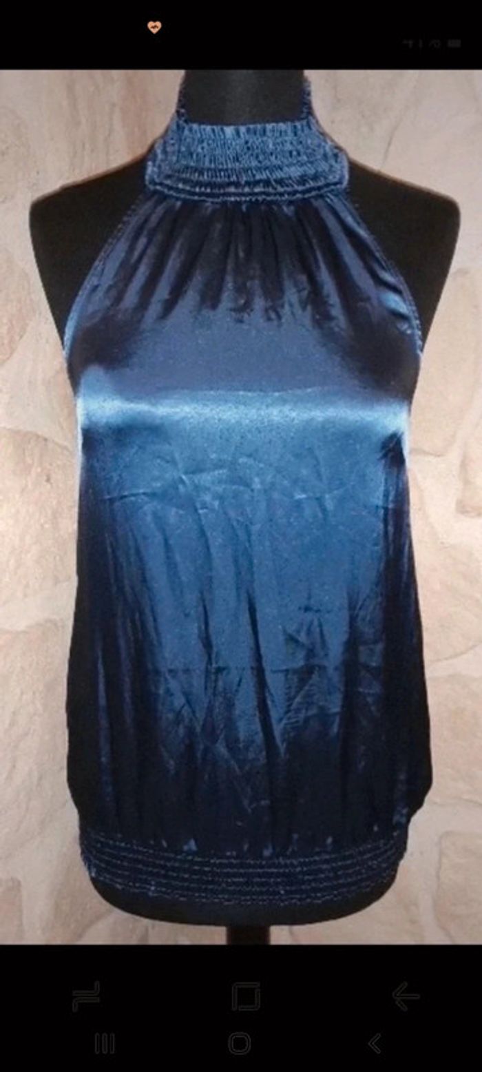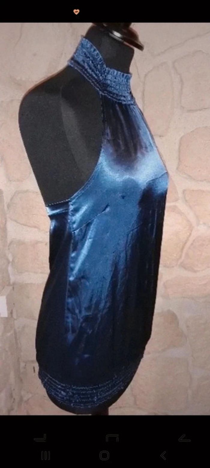 Haut femme taille 36 Naf Naf bleu nuit satiné. Top dos nu col montant. Très léger. Idéal pour soirée. Très bon état #vayssadefemme36
