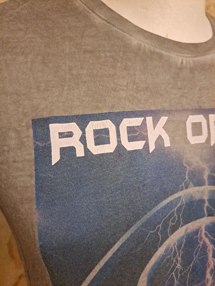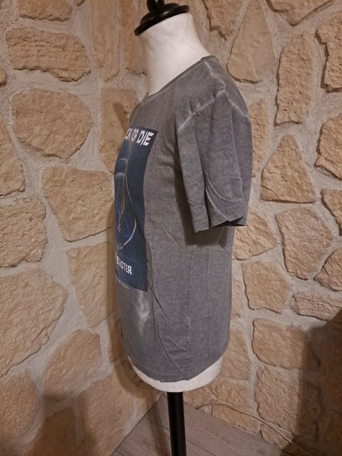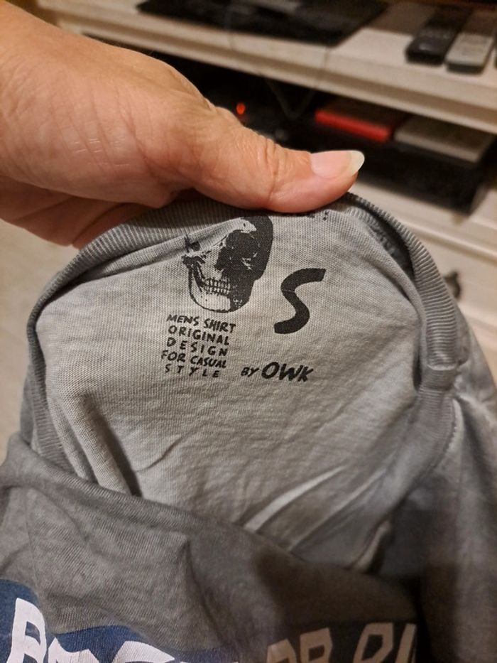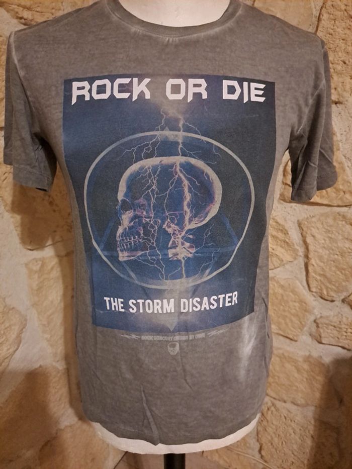 Tee-shirt homme ado OWK taille S Très bon état. Très légères craquelures sur quelques lettres. Motif tête de mort. Écriture Rock of die Étiquette composition coupée Couleur gris vieilli naturel. #vayssadehomme