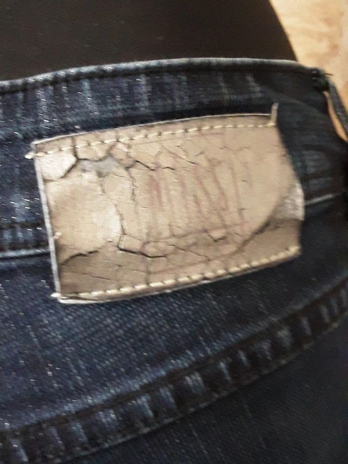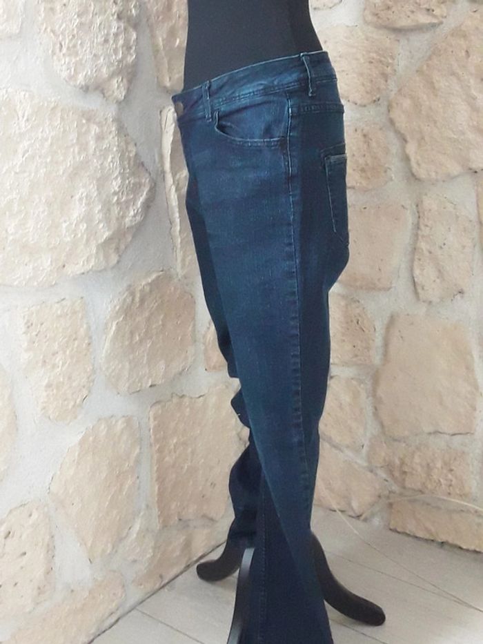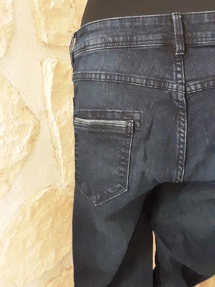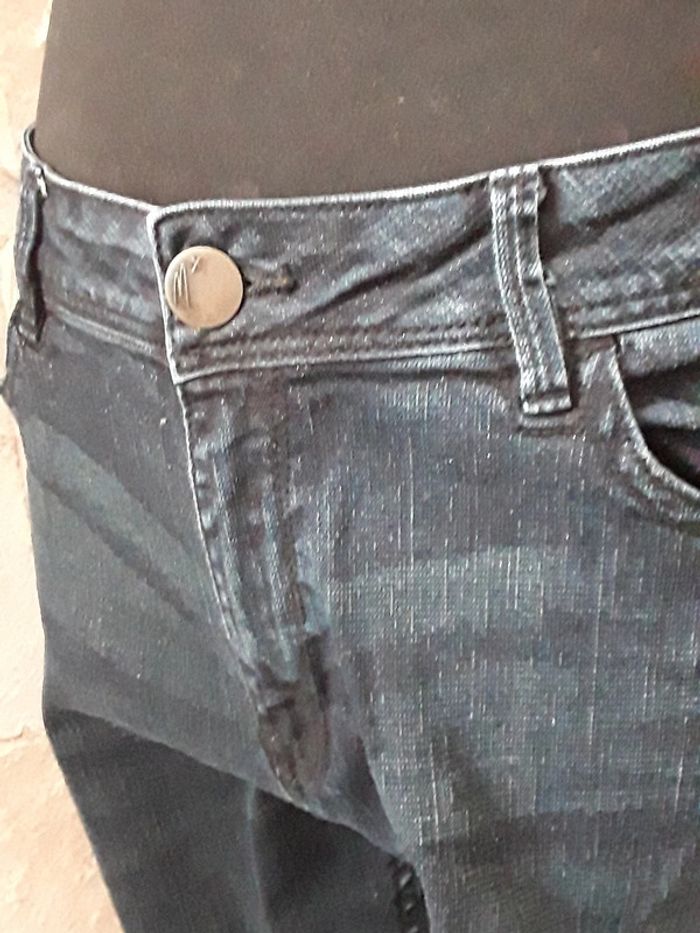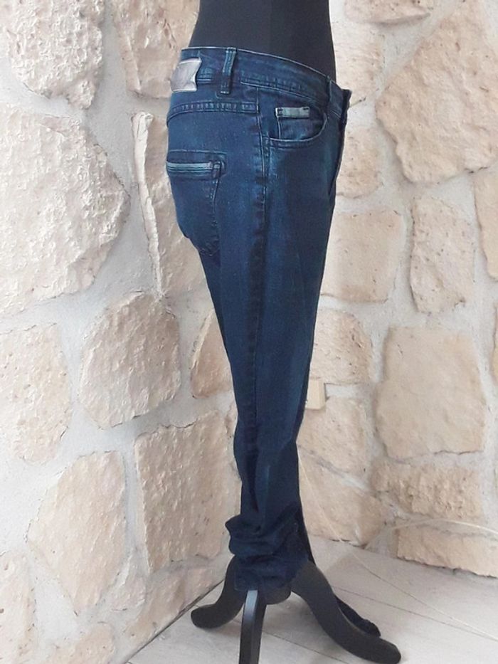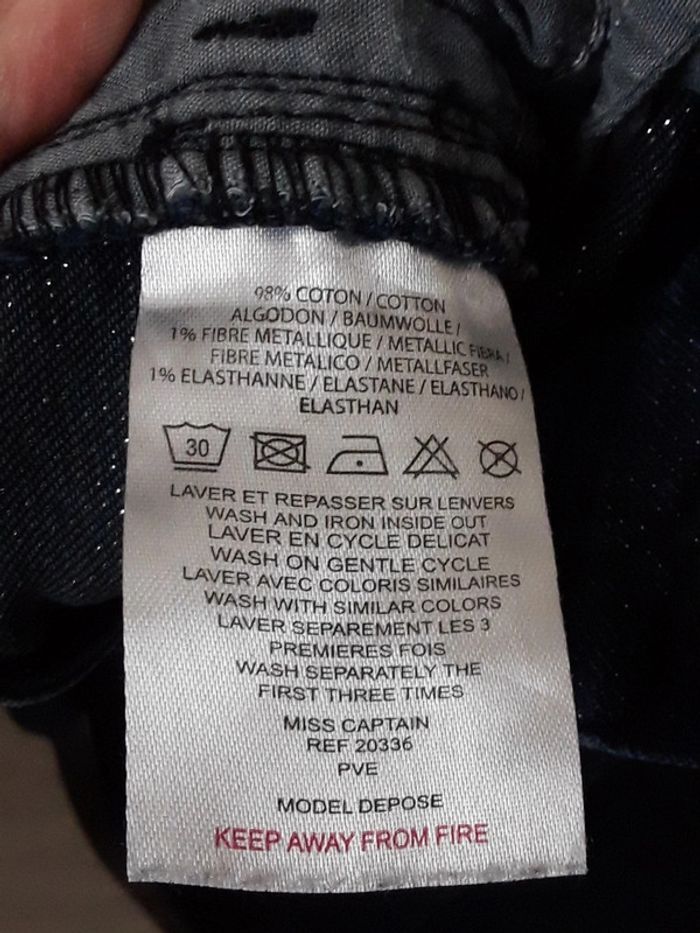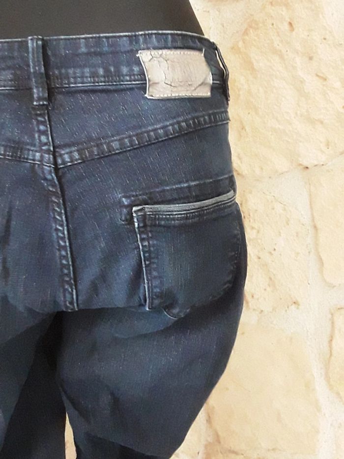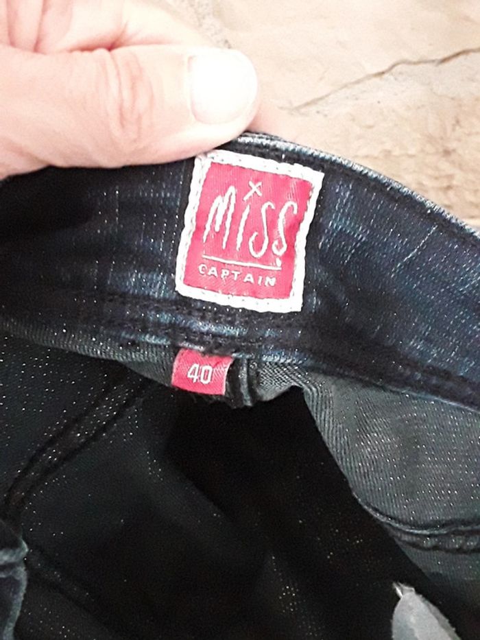Jean femme Miss Captain taille 40 Très bon état. Juste une petite zone un peu blanchie au genou (photo). Étiquette arrière craquelée (photo). Couleur bleu marine avec paillettes argentée #vayssadefemme40