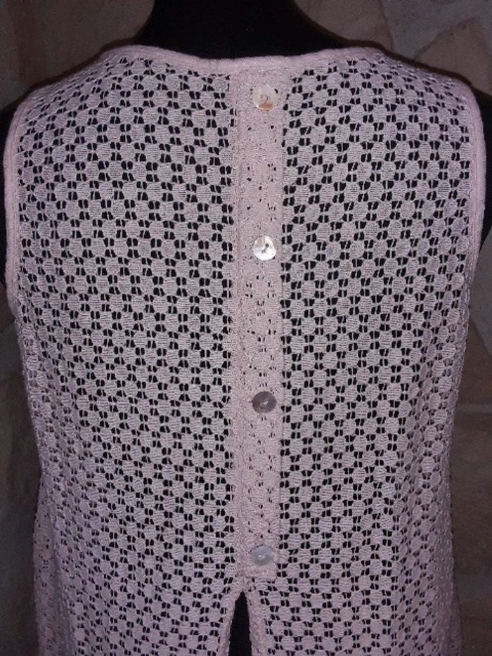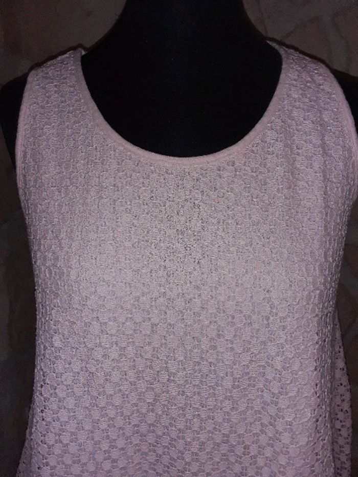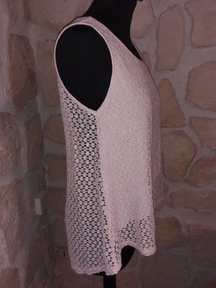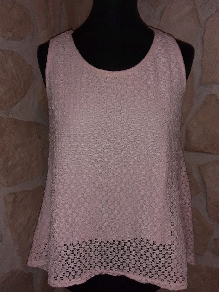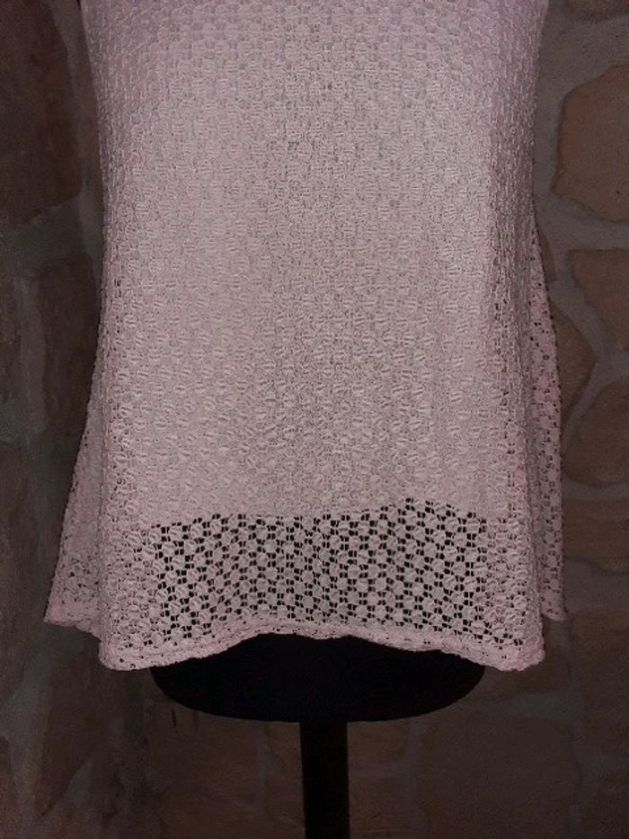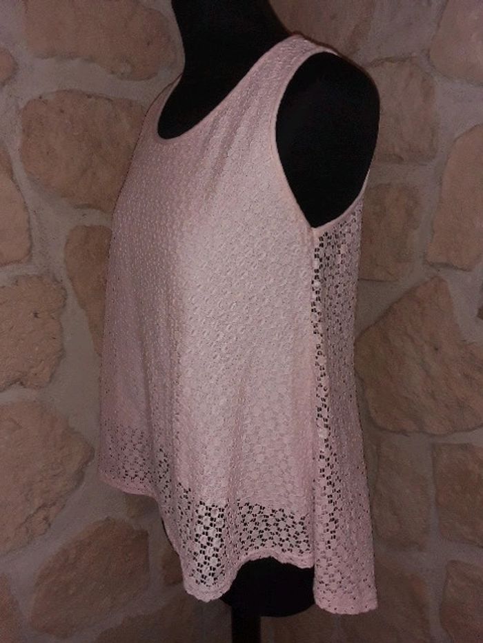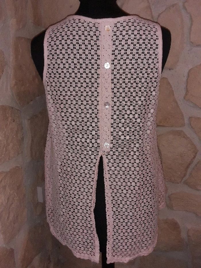 Haut dentelle sans manches Neuf jamais porté Correspond à un 38. Pas de taille mentionnée sur l'étiquette. Fabrication italienne. Doublure devant. Transparent derrière Fente à l'arrière Rose très pâle #vayssadefemme38