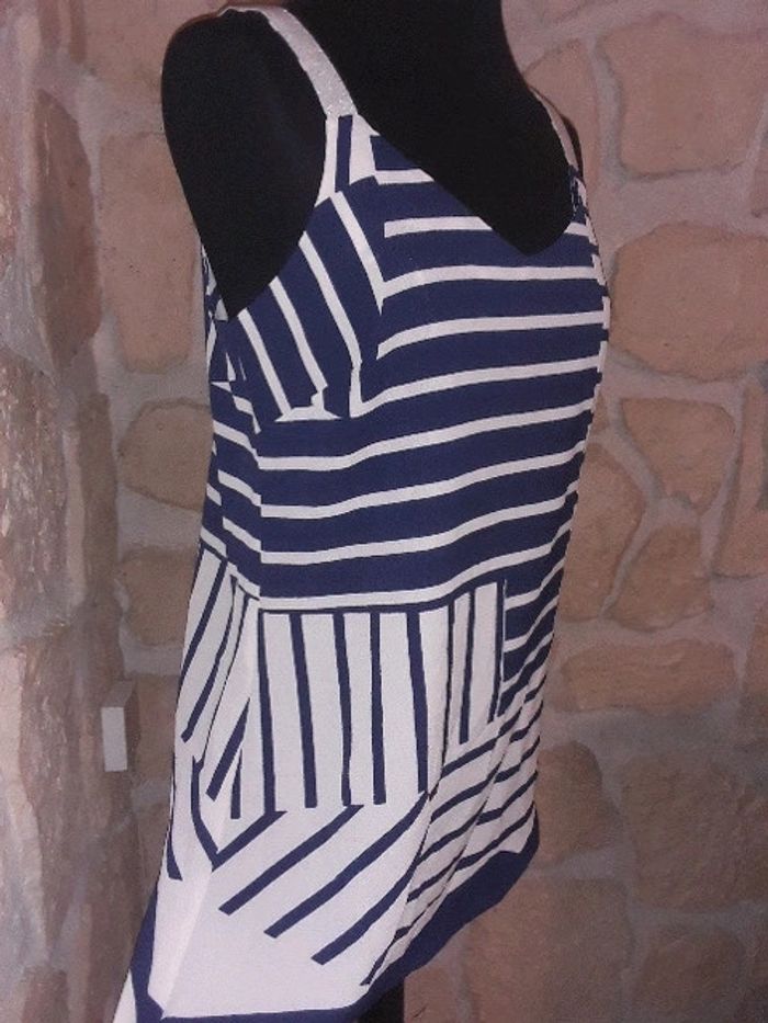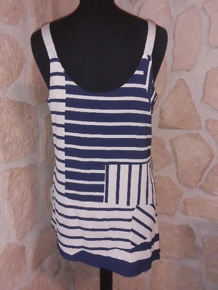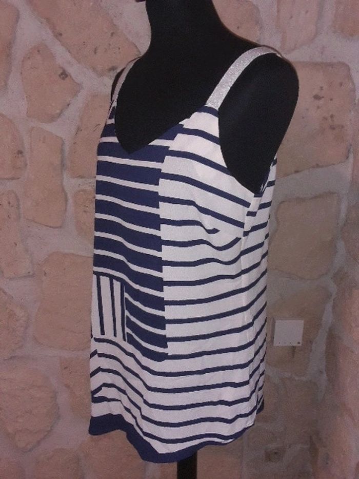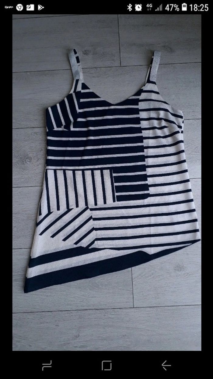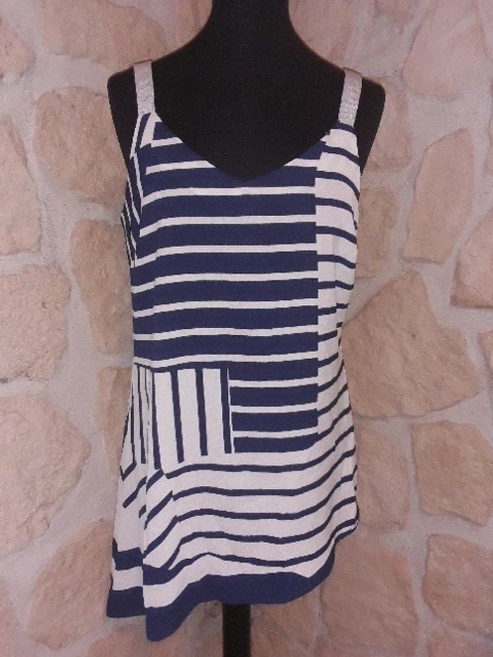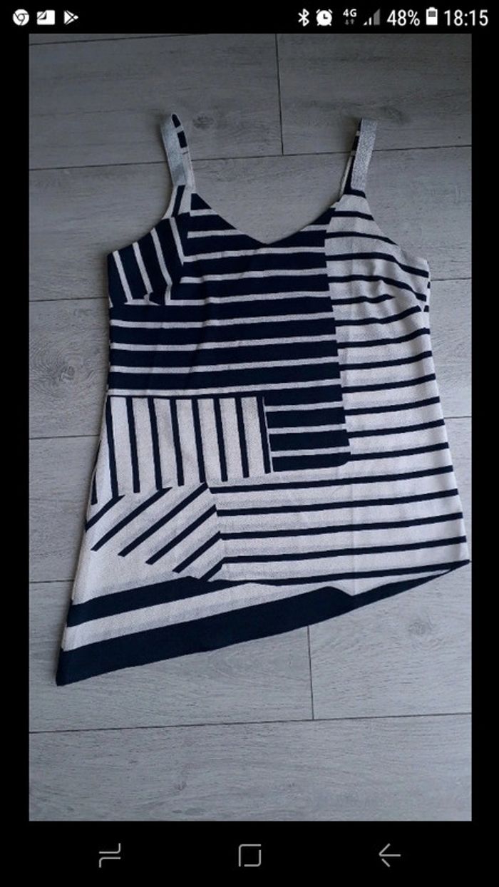 Débardeur asymétrique habillé Trend de chez Miss Capitain taille 38 Neuf jamais porté Bleu marine et blanc. Bretelles argentées. #vayssadefemme38