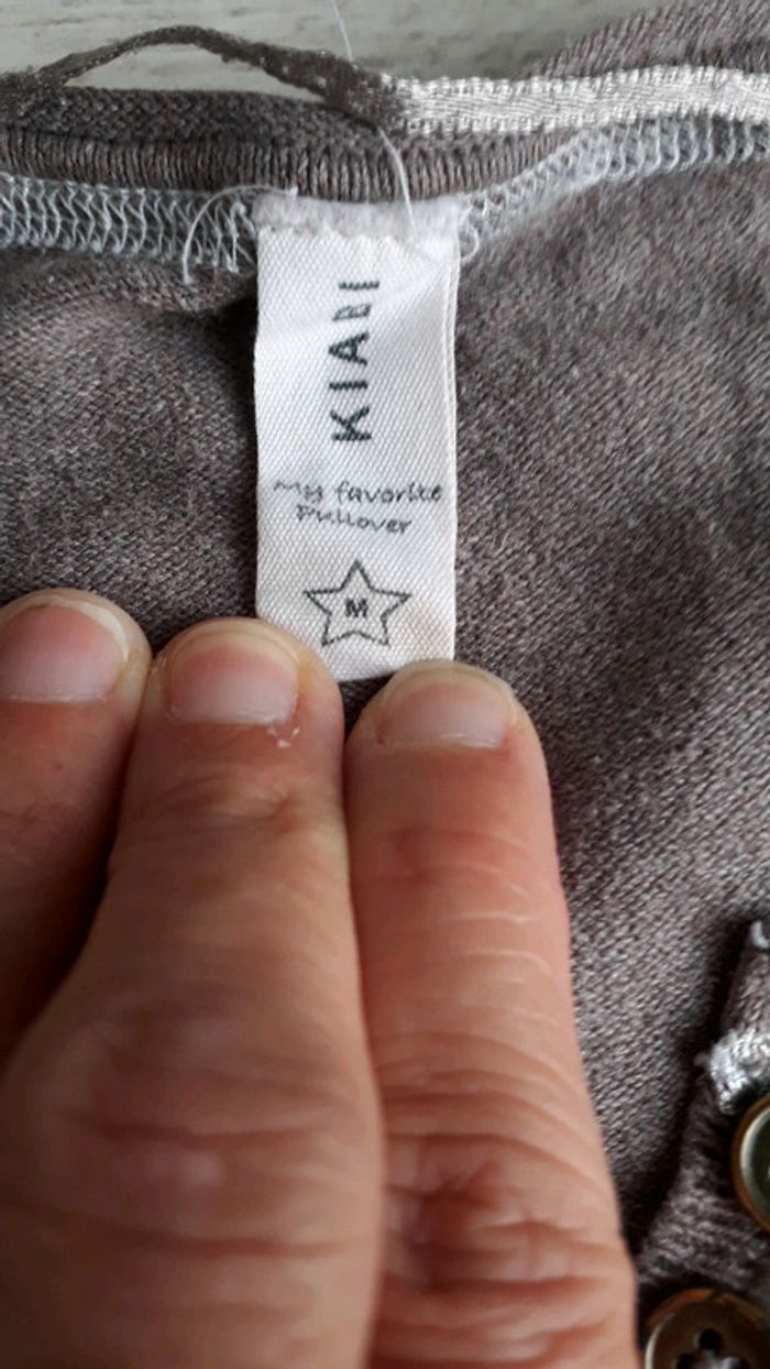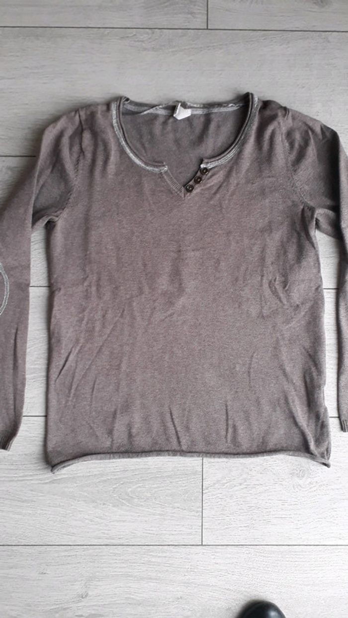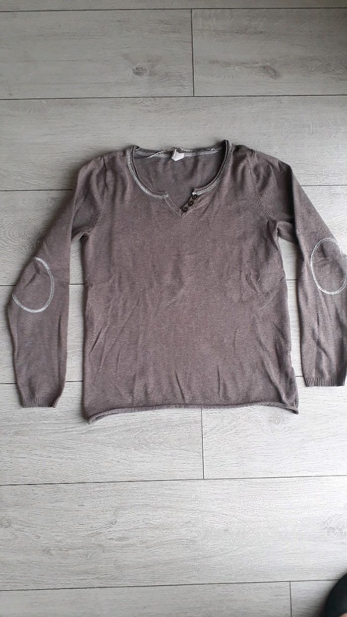 Pull léger Kiabi taille M. Marron clair avec liseré et coudières argentés. Bonton de rechange Très bon état Envoi uniquement par mondial relais #vayssadefemme38