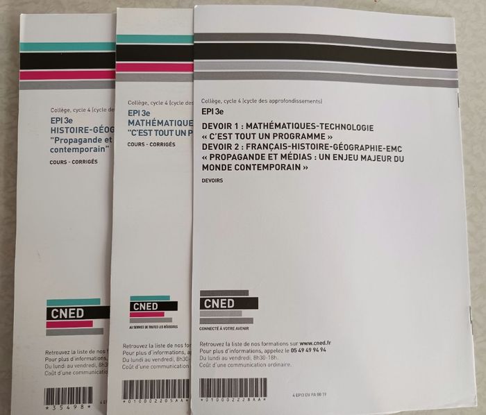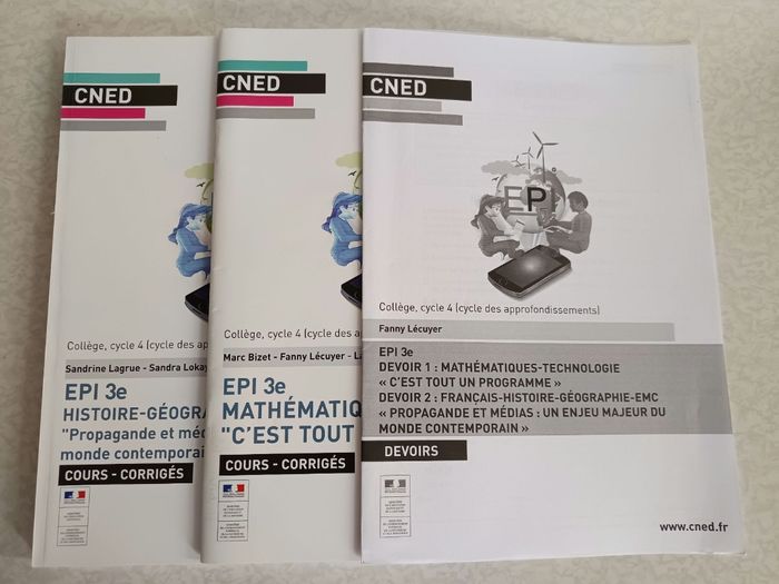Lot Complet de 3 articles CNED pour collège 3ème pour la matière EPI comprenant : Cours et Corrigés mathématiques technologies Cours et Corrigés Français, Histoire, Géographie, EMC Devoirs Les articles sont en très bon état général Écriture sur le côté pour repérage facile (voir dernière photo)