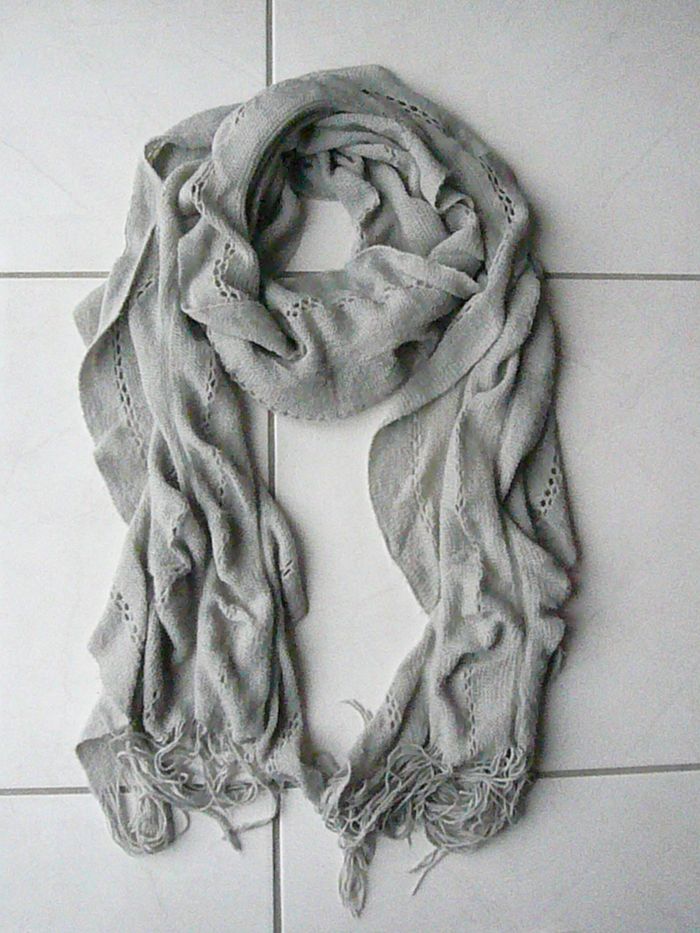 Grande écharpe en laine gris clair. Longueur : 230 cm x 40 cm. En très bon état.