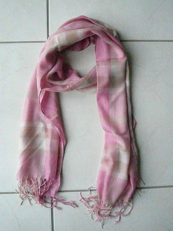 Echarpe rose avec franges. Dimensions : 200 cm x 52 cm. En très bon état.