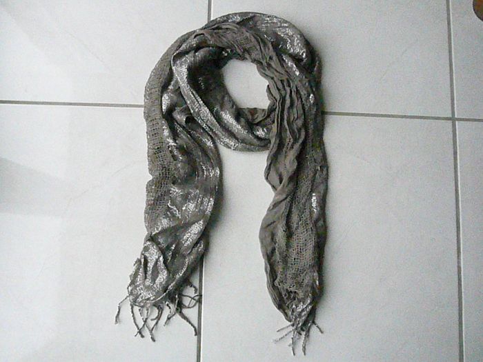 Echarpe longue fantaisie avec fils argentés. Coloris taupe. Longueur : 180 cm. En très bon état.
