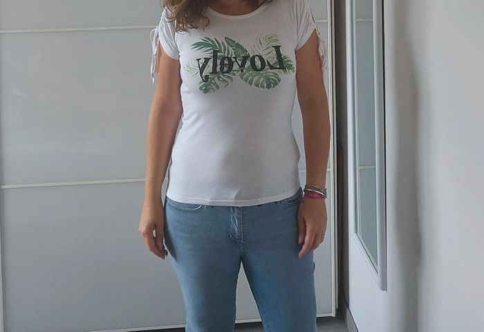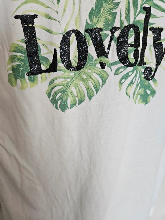 📌Lot 20% de remise dès 5 articles T-shirt blanc avec motif vert et écriture "Lovely" ➡️Largeur à plat sous les bras 43  cm➡️ Longueur 58  cm ⭐Etat NEUF ✈Envoi rapide des colis 💗 Abonnez vous à mon profil, nombreux articles ajoutés régulièrement ! #laetitresors_tshirt38 #laetitresors #tshirt #lovely #vert #blanc #cachecache #manche #courte #lien #nouer #epaule #lovely #feuille