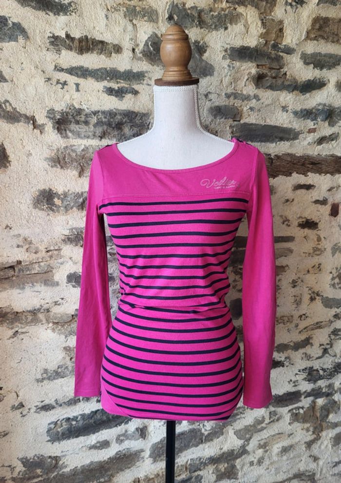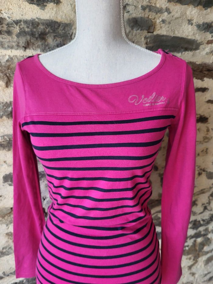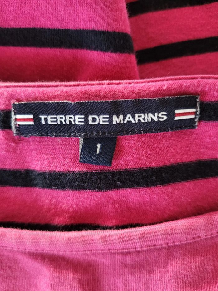Très beau T-shirt rayé style marinière rose fushia et noir manches longues Terre de Marins Taille 1 ou 34 Porté quelques fois mais toujours en très bon état #matka27_taille34 #taille34 #terredemarins #marinière #tshirt #rayé #fushia #noir #mancheslongues