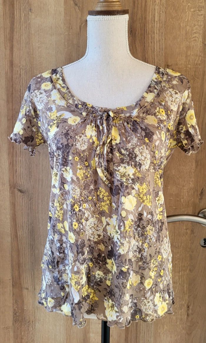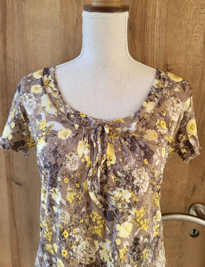 Blouse manches courtes fleurie jaune et marron beige Armand Thiery Taille 40