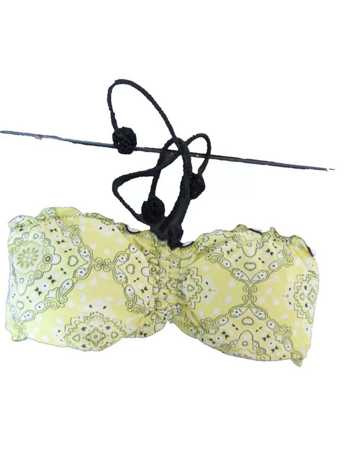 maillot de bain 2 pièces tons jaune imprimés et attaches noir marque despi taille indique L/G = 42/44 envoi rapide 1 jour maxi après l'achat achats groupés = frais de port réduits