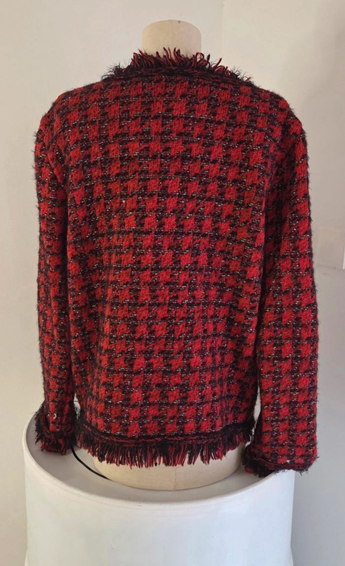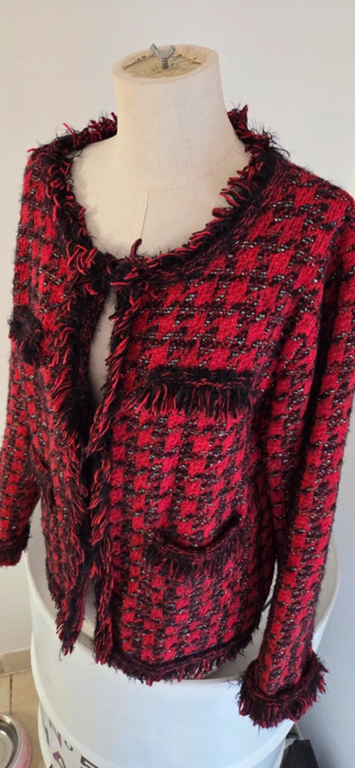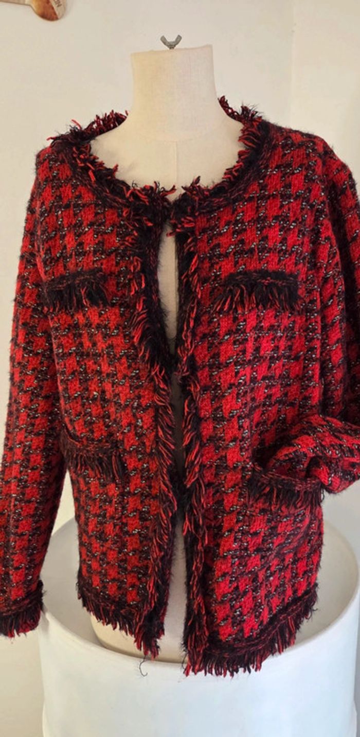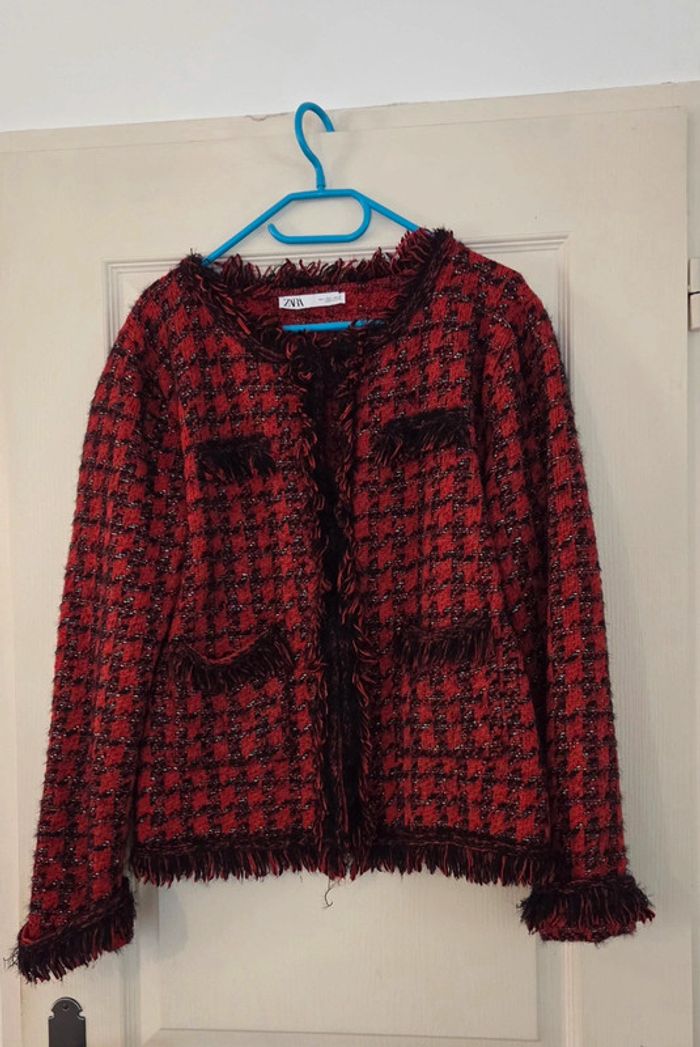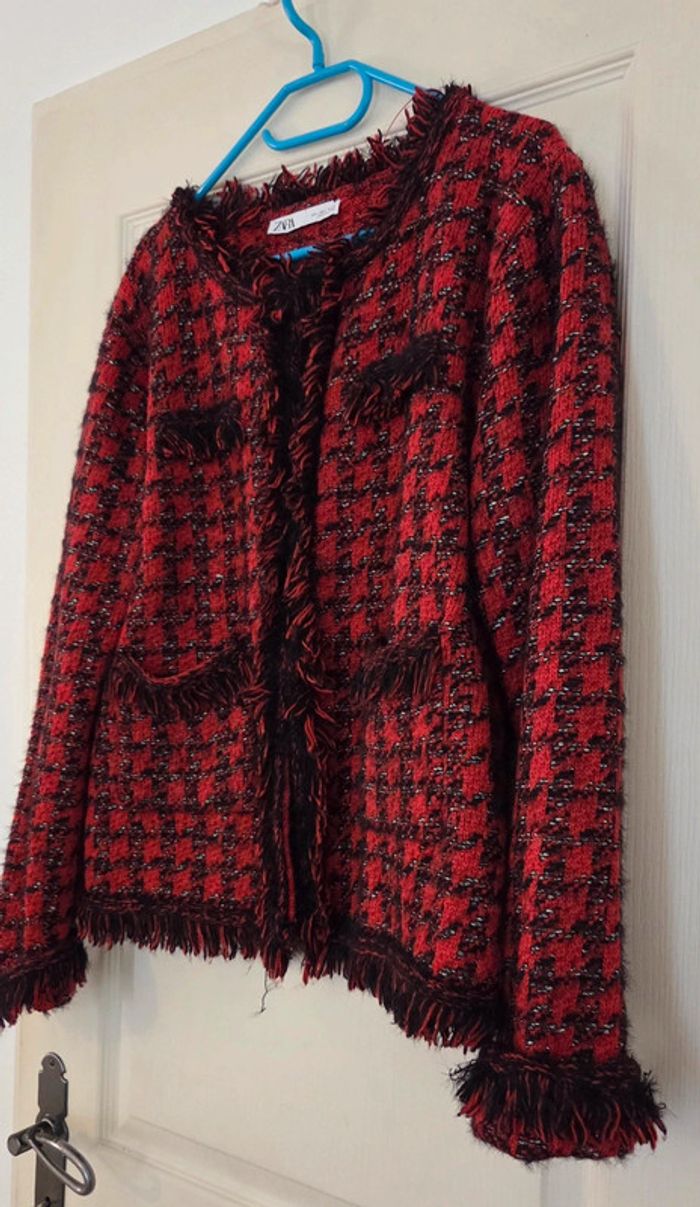 Veste Zara Taille L Longueur 65 cm Largeur sous bras : 56 cm Coloris rouge et noir Motif carreau, effet pied de poule Excellent état Étiquette intérieure coupée ✨ Envoi rapide ✨ 🌹 Envoi groupé possible 🌹