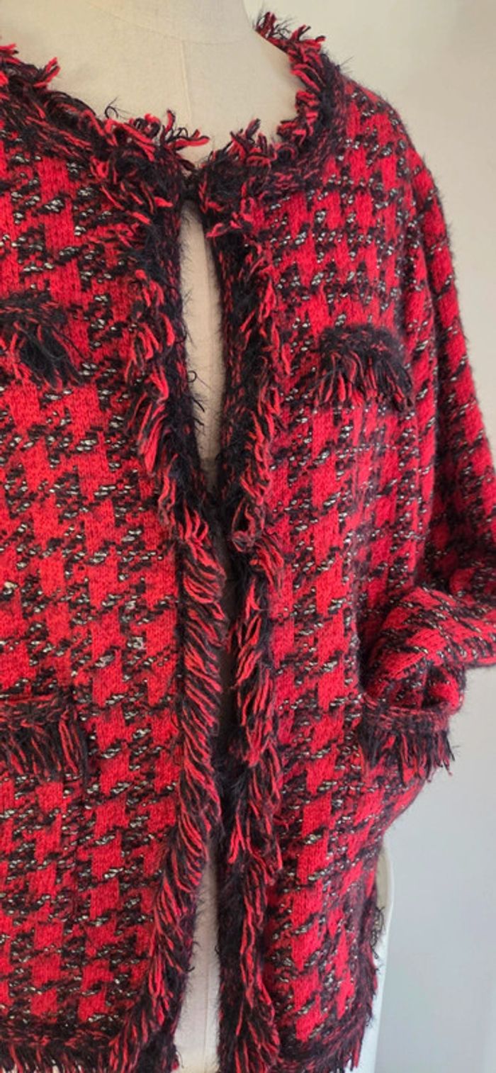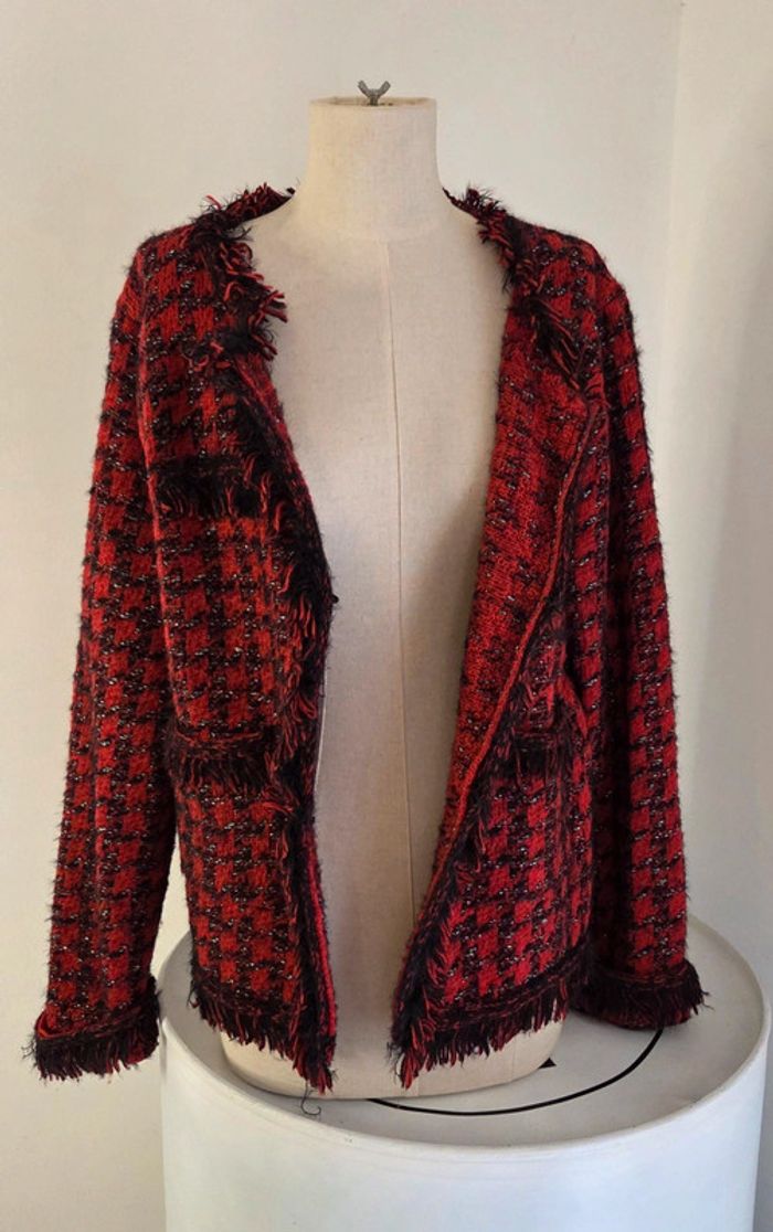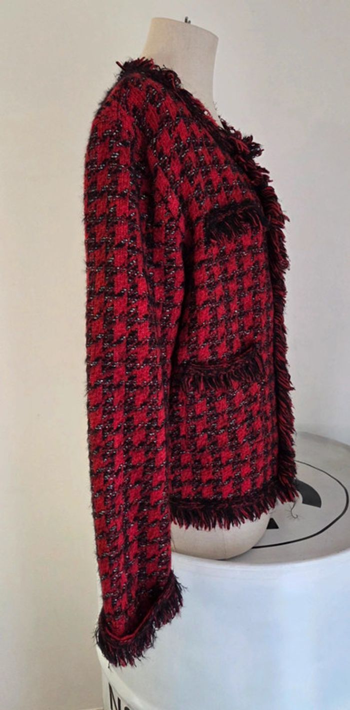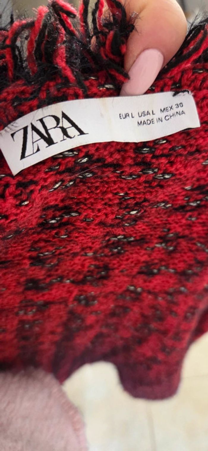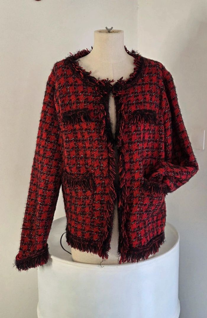 Veste Zara Taille L Longueur 65 cm Largeur sous bras : 56 cm Coloris rouge et noir Motif carreau, effet pied de poule Excellent état Étiquette intérieure coupée ✨ Envoi rapide ✨ 🌹 Envoi groupé possible 🌹