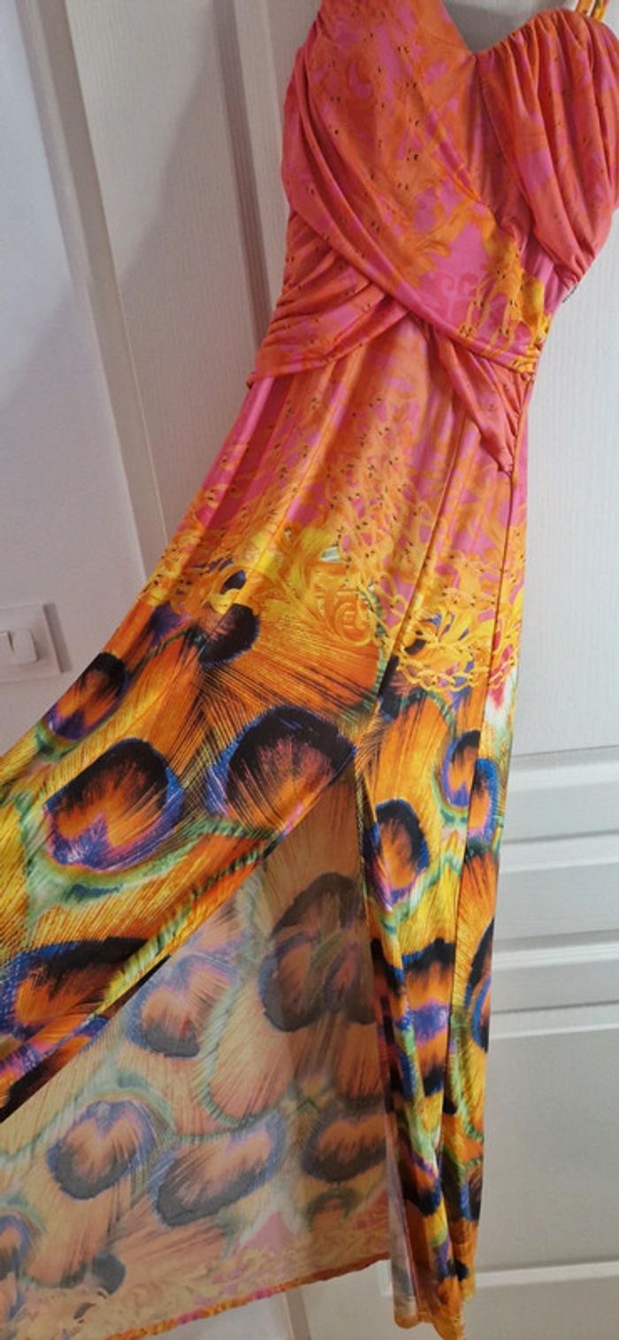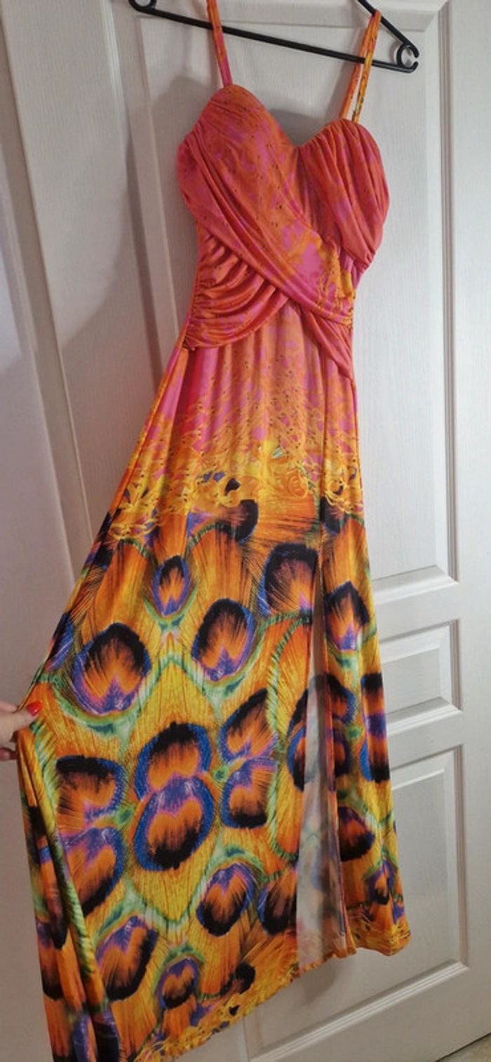 Magnifique robe longue colorée, légèrement fendue sur le côté. Au niveau de la poitrine il y a des coques, les bretelles sont réglables. On peut même enlever les bretelles. Idéal pour une taille 36 et 38, voir 40. Peu portée en excellent état ✨ Envoi rapide ✨ 🌹 Envoi groupé possible 🌹