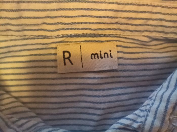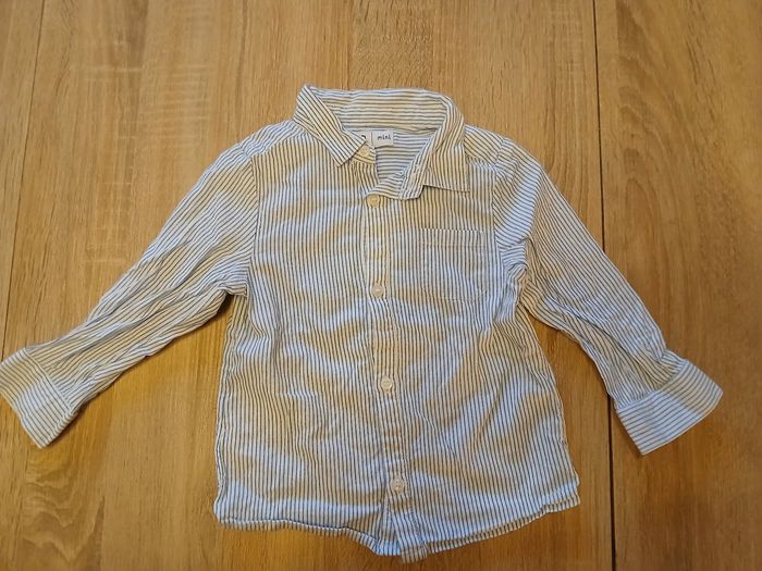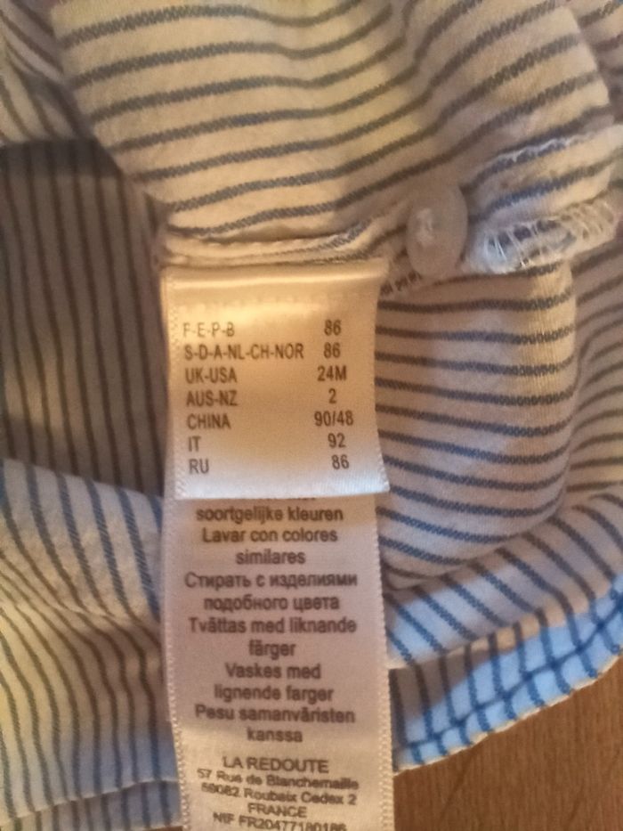 Chemise blanche manches longues a petites rayures bleu clair, de la marque La Redoute. Très bon état. Taille 86 cm