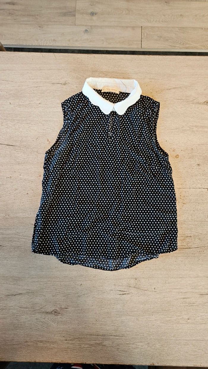 Jolie blouse fluide noire avec des points blancs. Col blanc avec des arrondis. Le col se ferme par 1 bouton. Nickel car ma fille n aime pas et ne l a mis qu une fois. 42 cm d aisselle à aisselle #deborahtock_femmeXS #deborahtock_femmeS