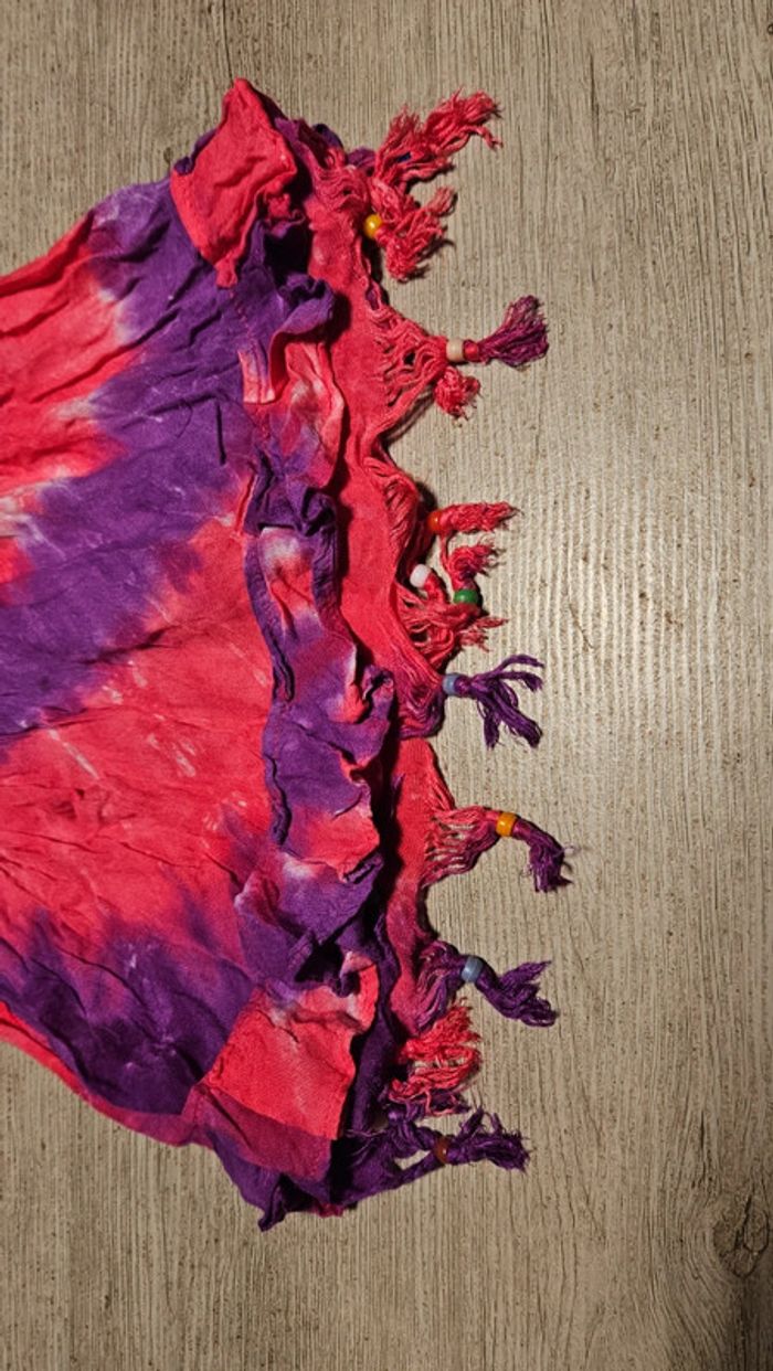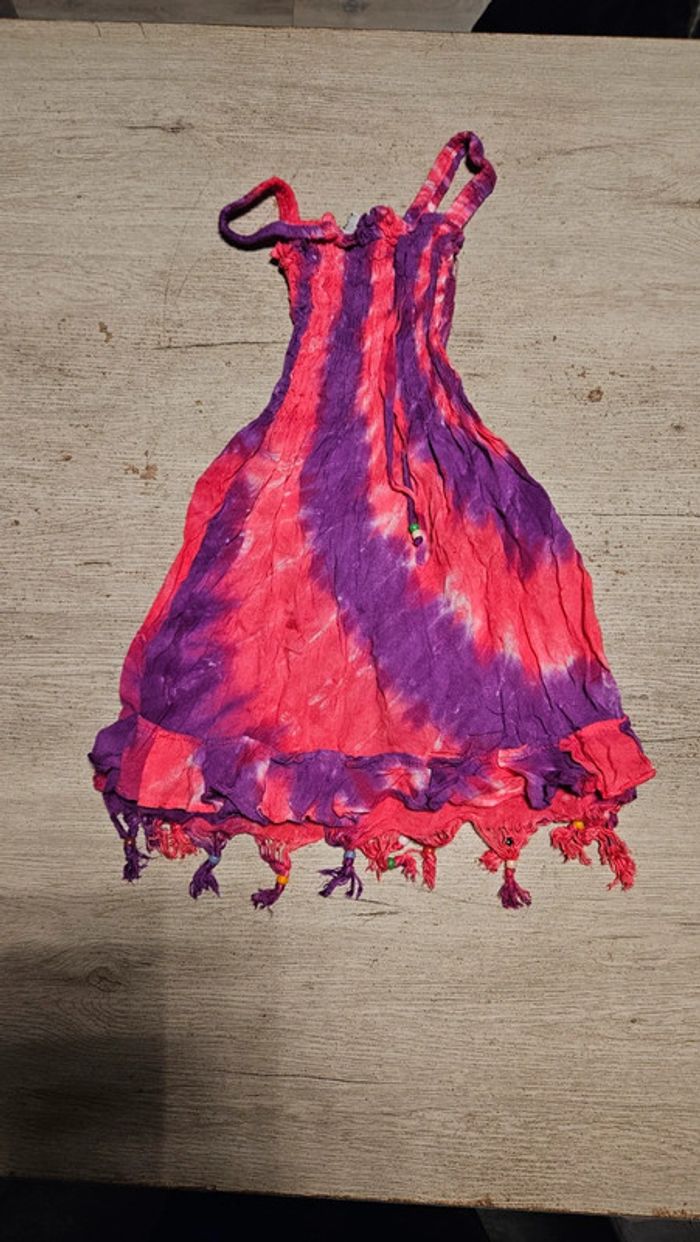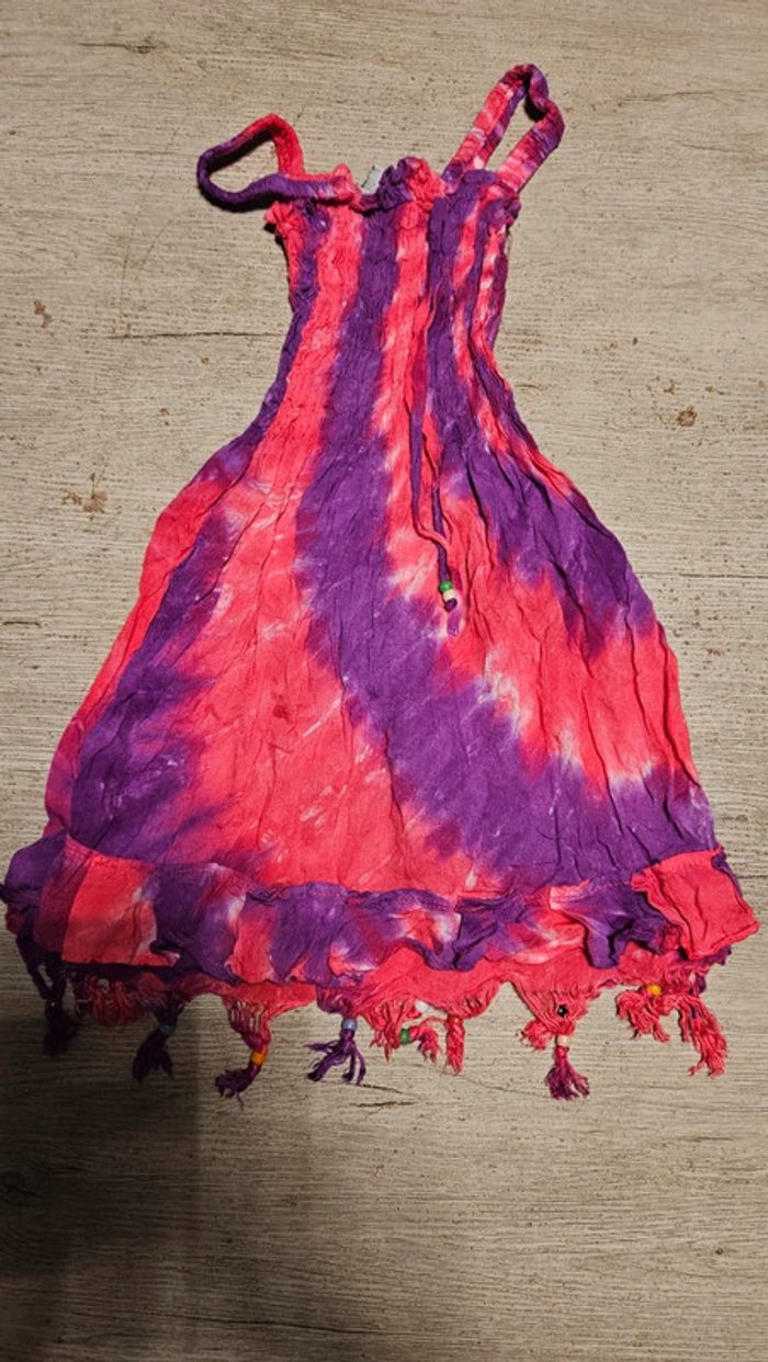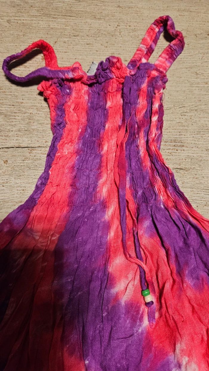 Jolie robe d été légère et colorée. Le haut est élastique. Le bas est évasée et effiloche avec des perles Elle a été mise mais est encore bien #deborahtock_6ans