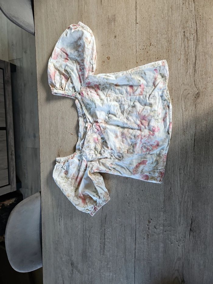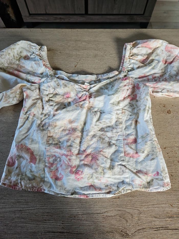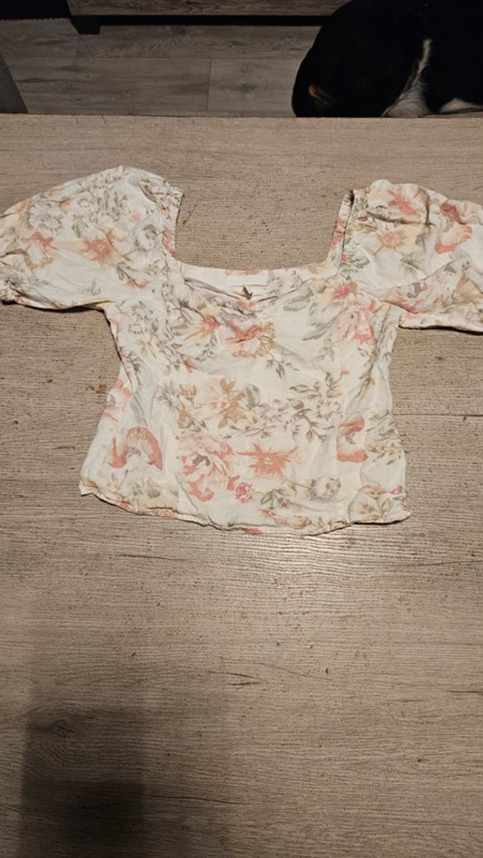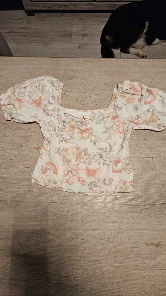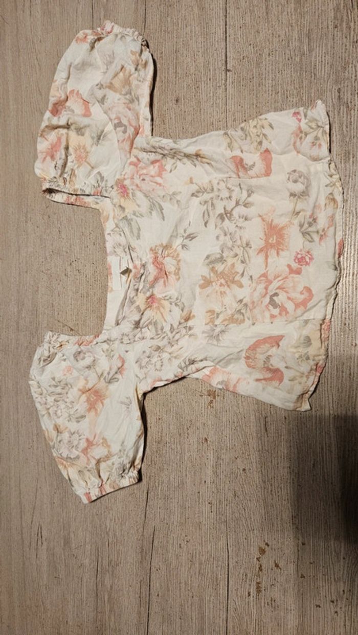 Croc top en lin et viscose. Il est beige clair avec des fleurs très pale. Epaules et bas des manches elastique. Mis une seule fois pour un mariage. Convient bien pour du S voire petit M. Acheté 25€ il y a quelques mois #deborahtock_femmeS