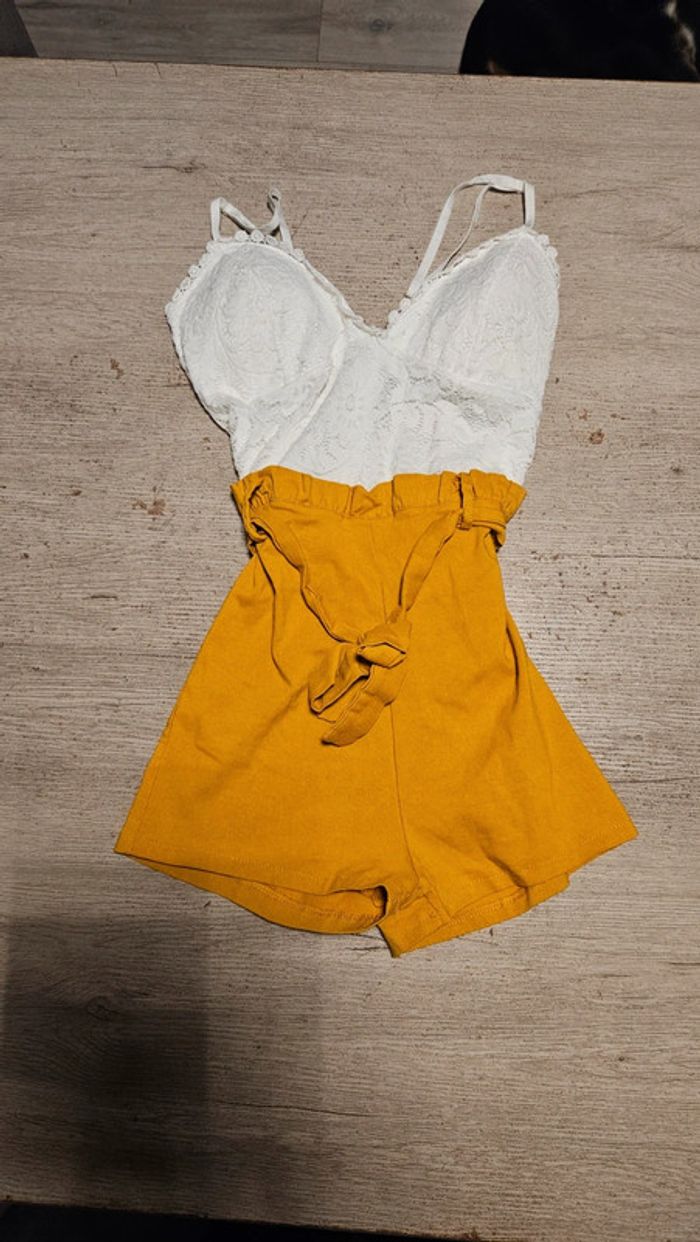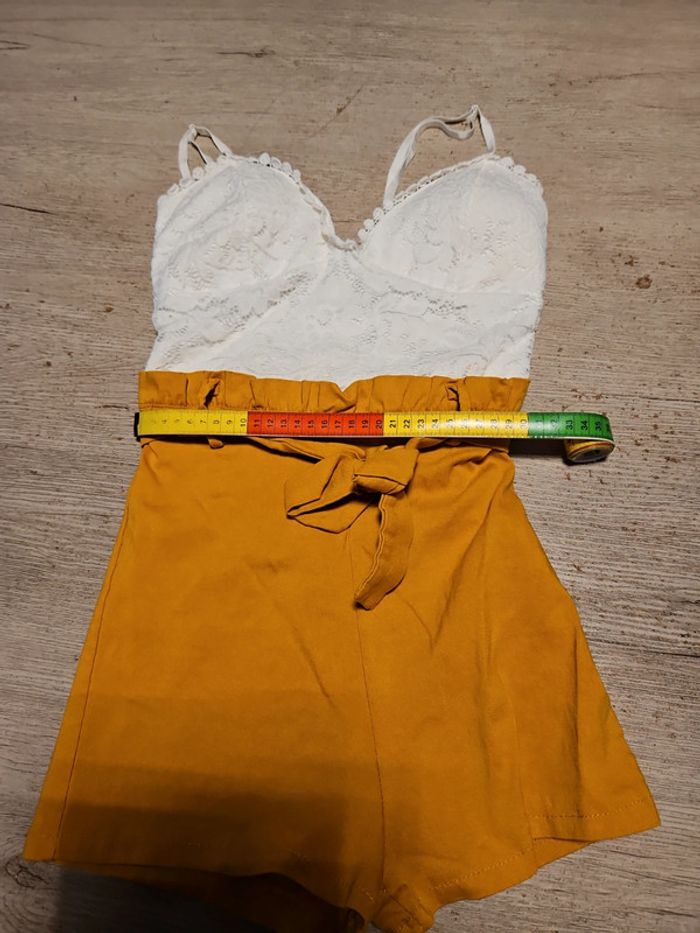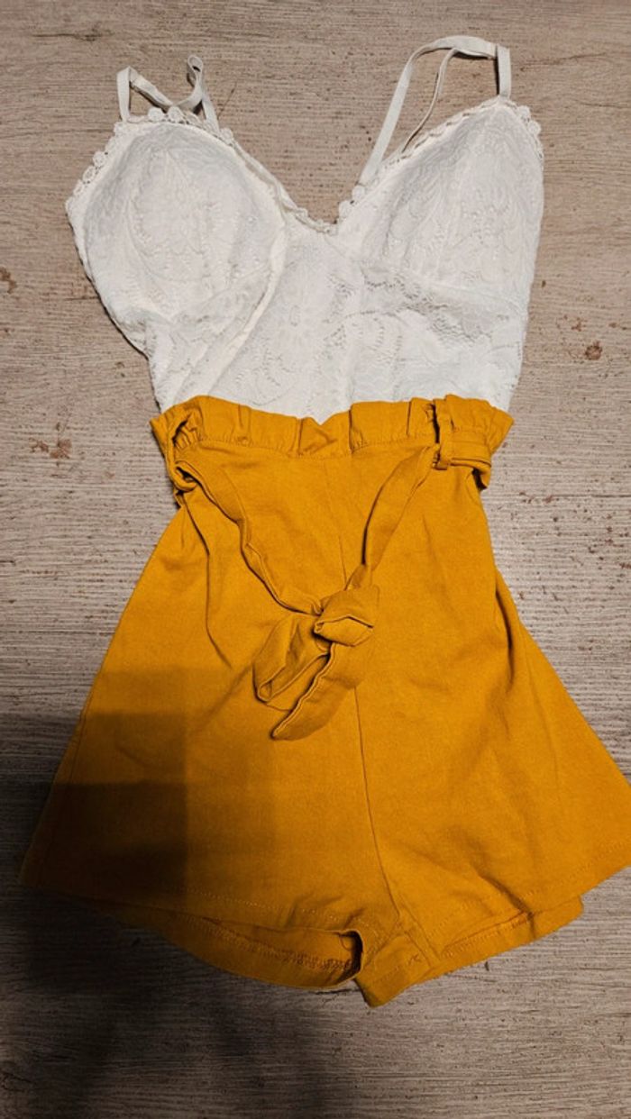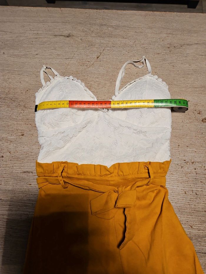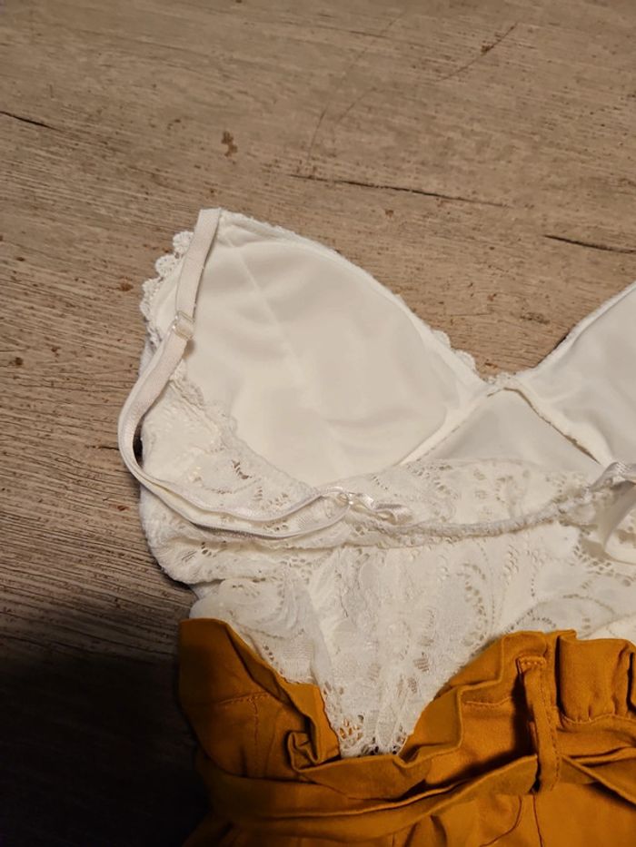 Combi short dont le bas est moutarde et le haut est blanc en dentelle. Les bretelles sont règlables. Poitrine rembourrée. Élastique. Essayé et lavé mais non mis car trop juste. Convient bien pour du XS à S. Taille de 31 cm #deborahtock_femmeXS