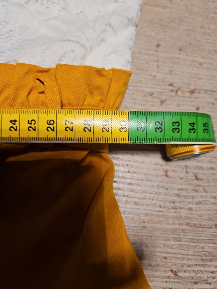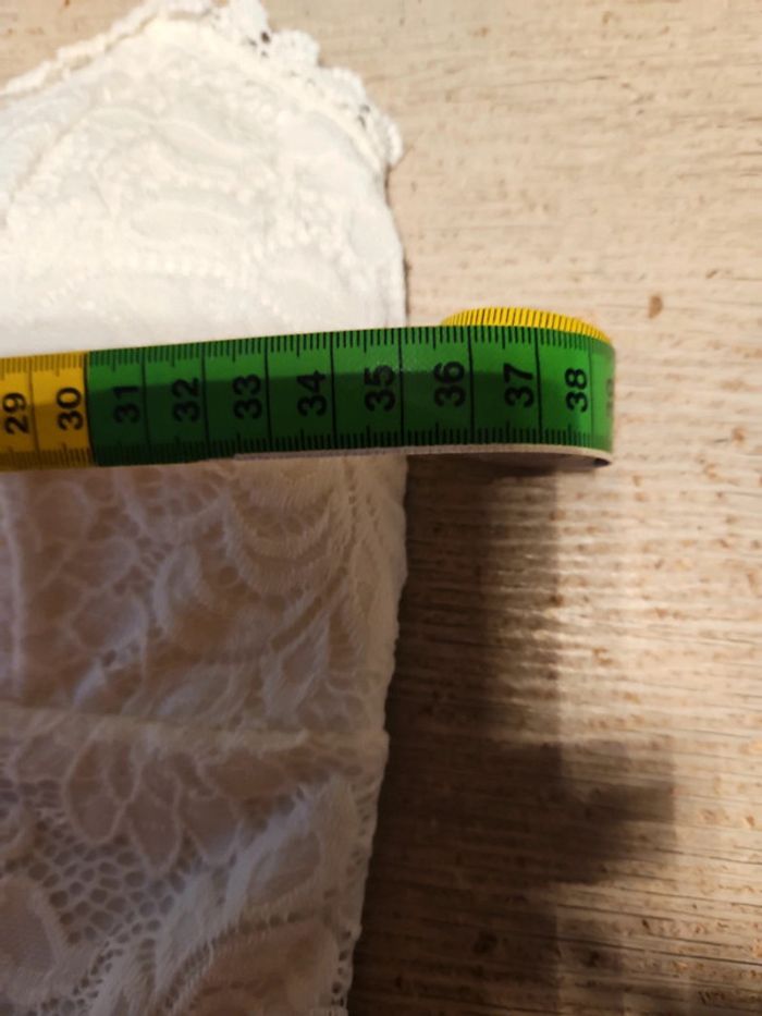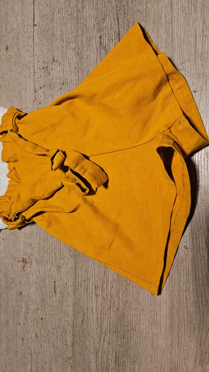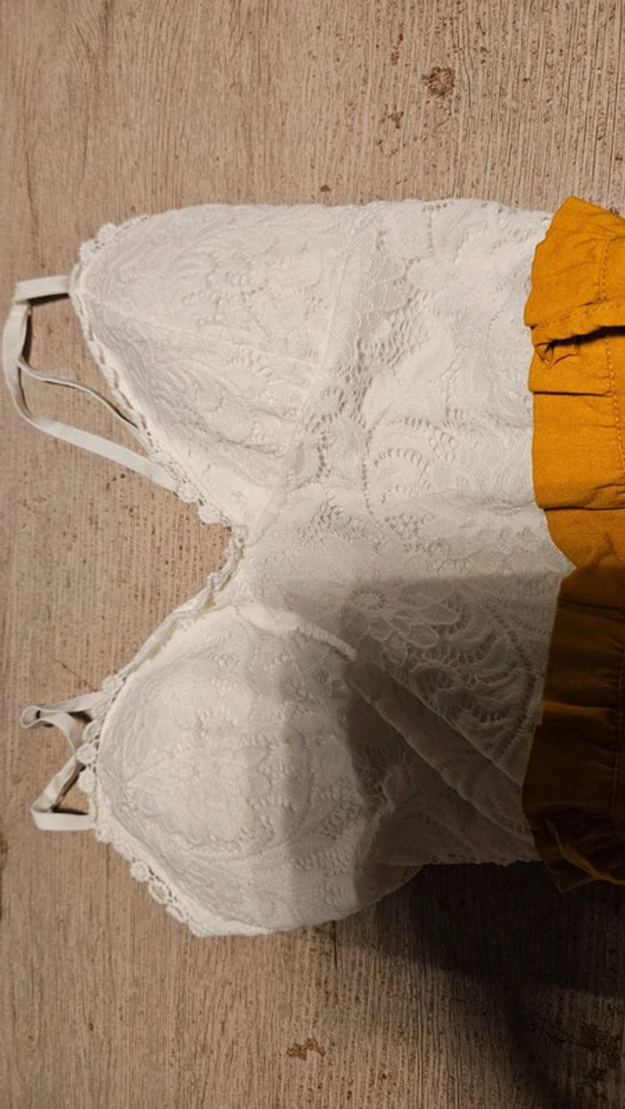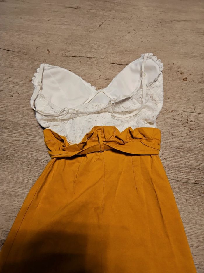 Combi short dont le bas est moutarde et le haut est blanc en dentelle. Les bretelles sont règlables. Poitrine rembourrée. Élastique. Essayé et lavé mais non mis car trop juste. Convient bien pour du XS à S. Taille de 31 cm #deborahtock_femmeXS