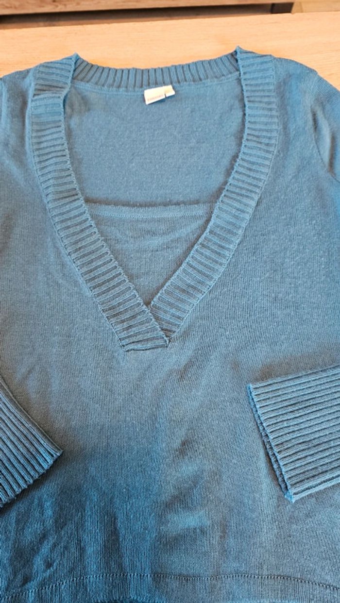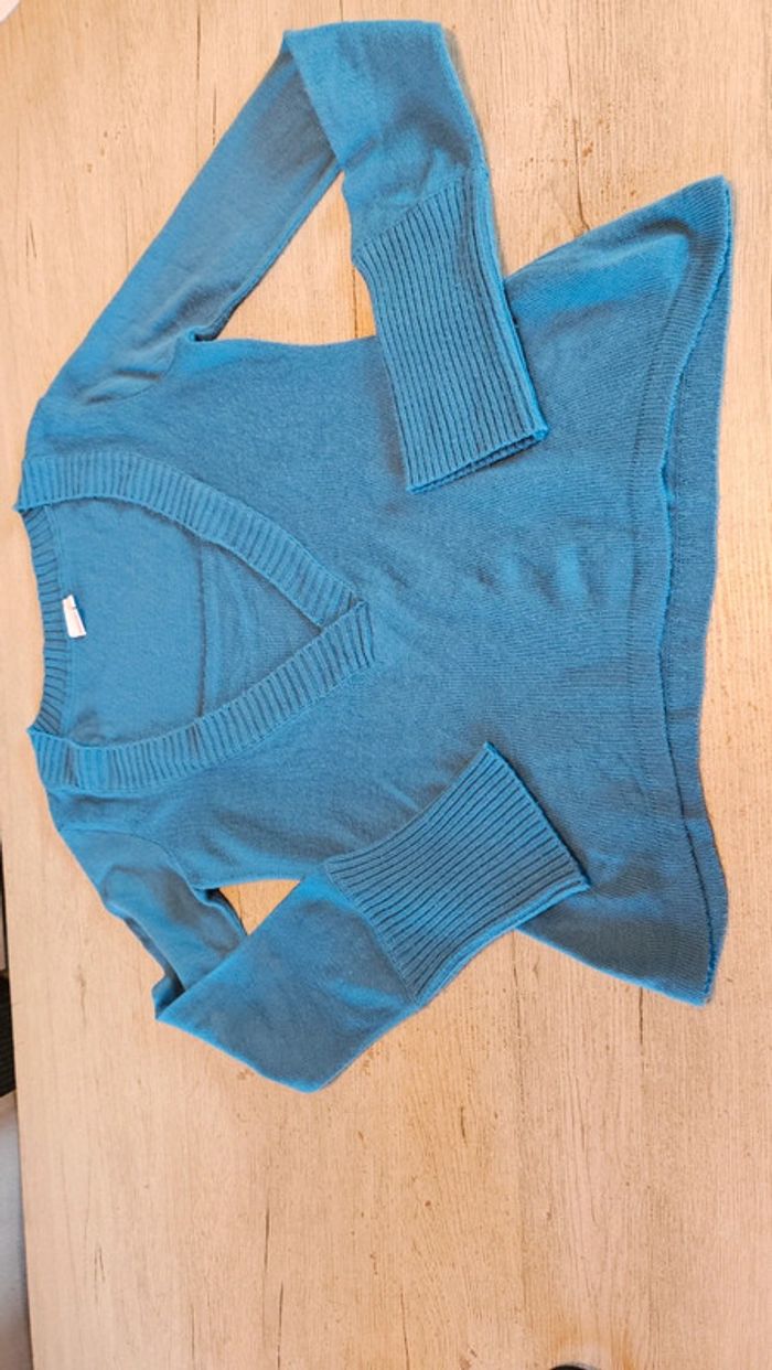 Pull bleu en bon état car peu mis. Il y a un col en V plongeant mais avec un bout de t shirt en dessous. Assez long. Élastique et retroussable à la fin des manches. Convient bien pour du M ou petit L #deborahtock_femmeM #deborahtock_femmeL