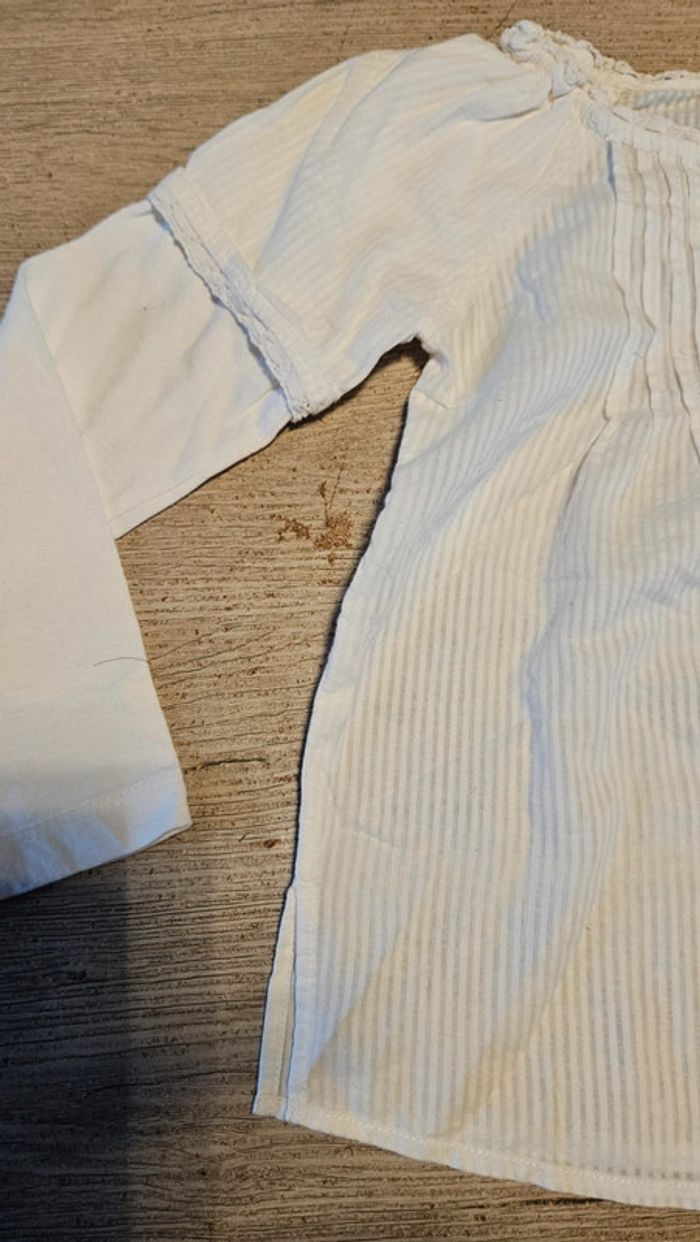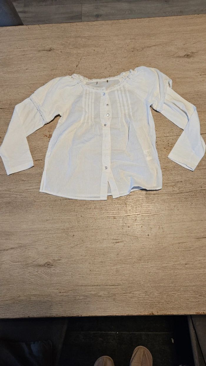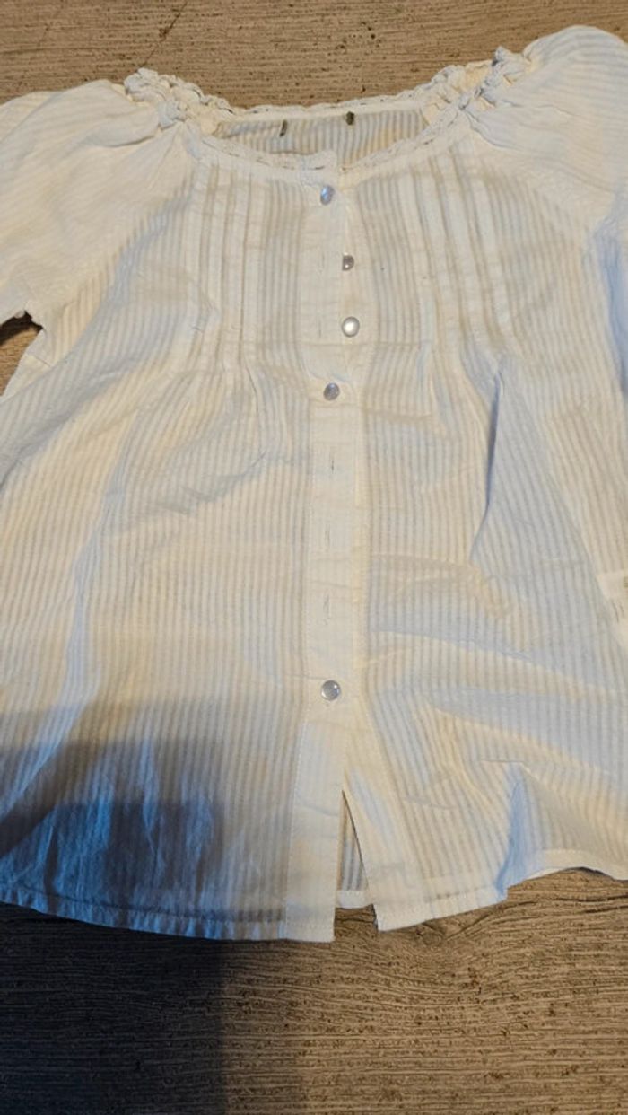 Chemise classique, blanche pour fille. Manches longues. Mise 1 fois pour un évènement. Je ne sais plus oû je l ai acheté et j ai enlevé l etiquette. Impression d un t shirt en dessous. Convient bien pour du 5 ans #deborahtock_5ans