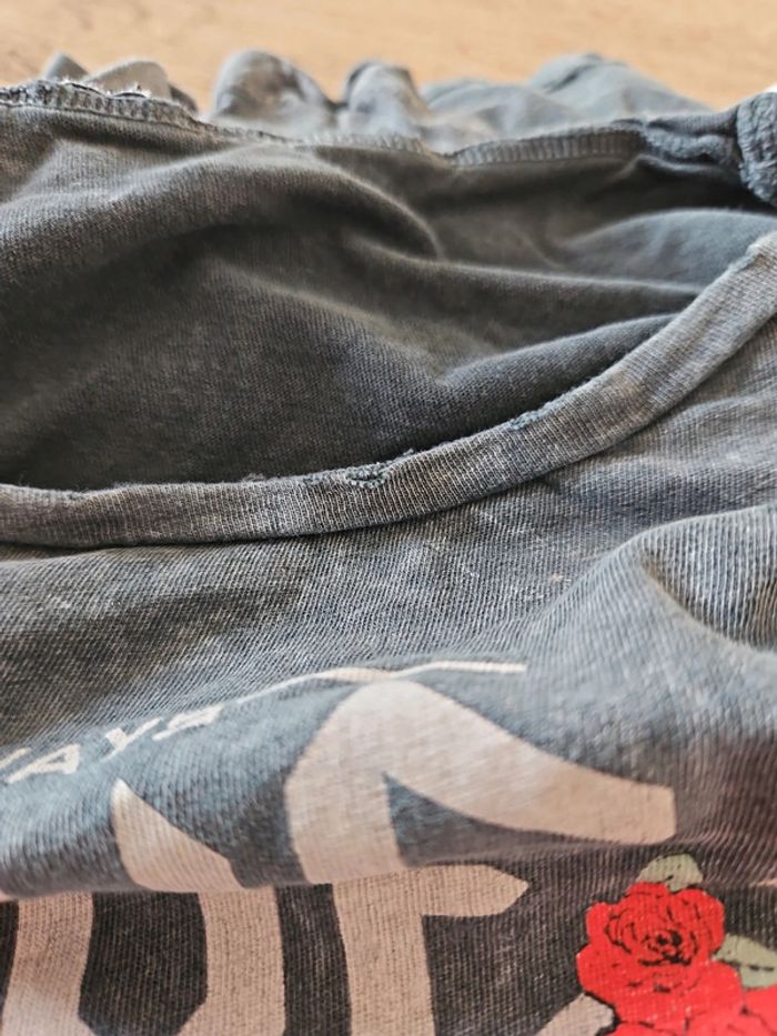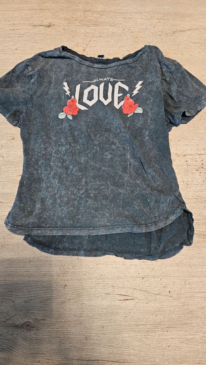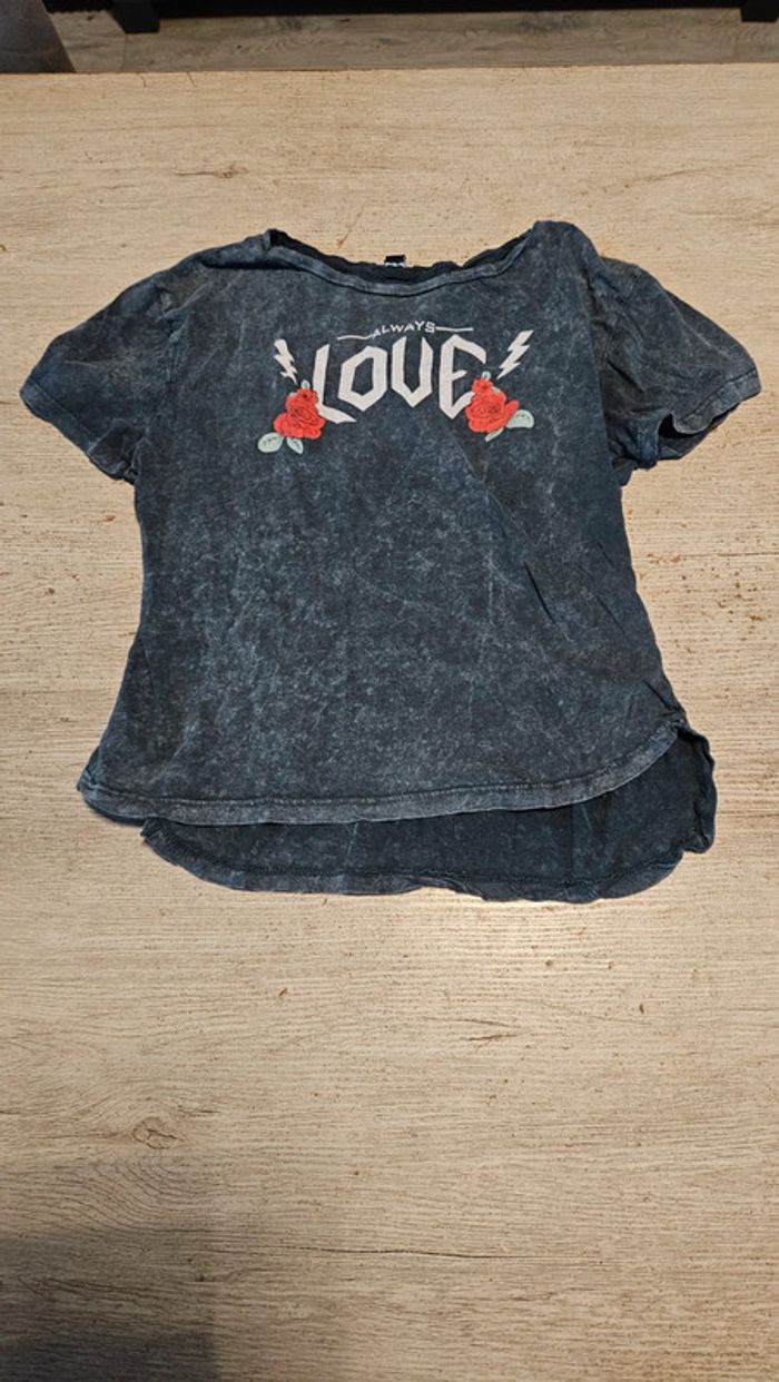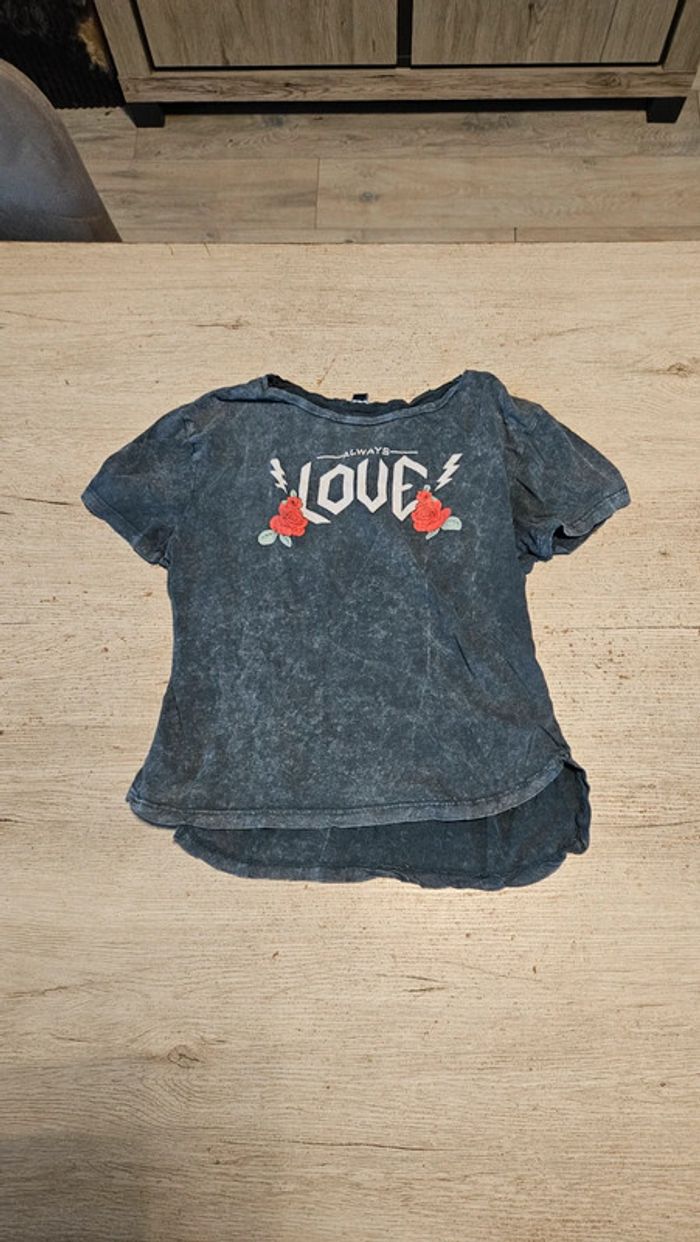 T shirt ado mis. Il est gris délavé avec des roses rouges. Col rond large, légèrement abimé, voir les 2 dernières photos. Convient pour du 12 à 14 ans #deborahtock_12ans