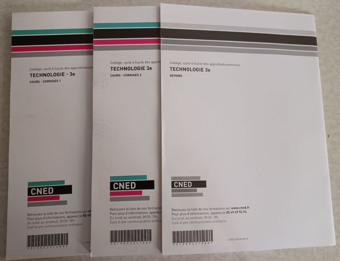 Lot Complet de 3 articles CNED pour collège 3ème pour la matière Technologies comprenant : Cours et Corrigés 1 et 2 Devoirs Les articles sont en très bon état général Ecriture sur le coté pour repérage facile (voir dernière photo)