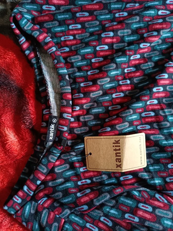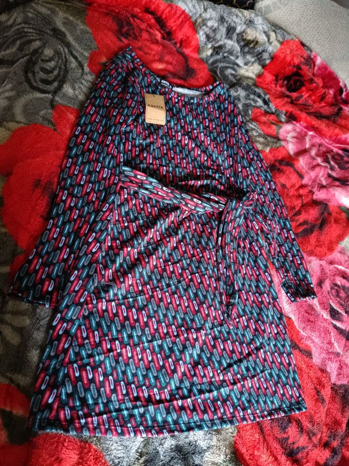 Robe manche longue taille XL avec étiquette resserrer sur un côté niveau taille et ceinture col rond arrive au genou
