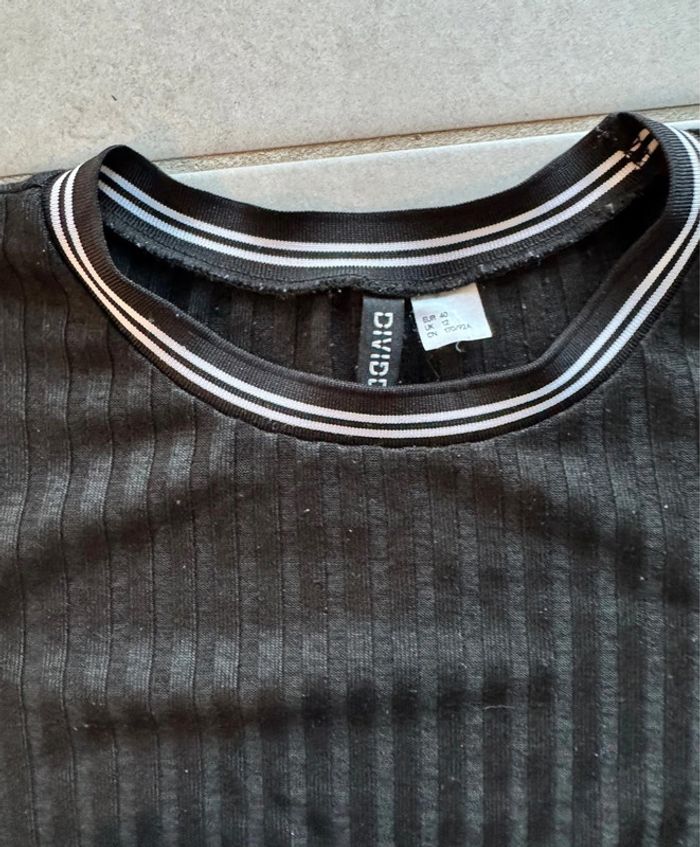 Robe noire moulante avec détails blanc sur col et manches. Rainurée Taille indiquée 40 mais taille petit Marque H&M Très bon état.