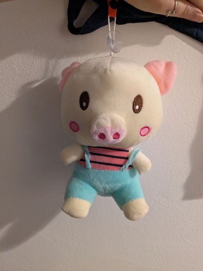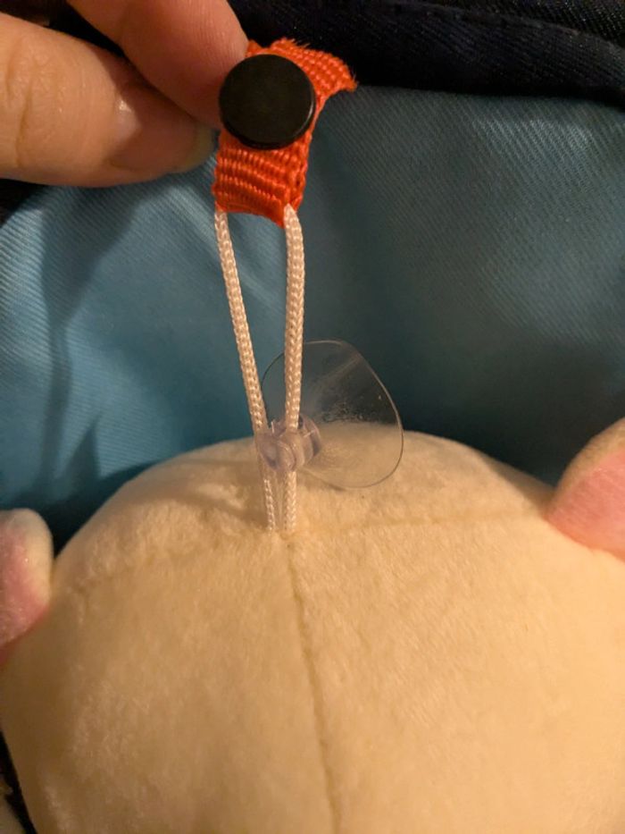 Sac à dos doudou cochon Le doudou se retire facilement et retrouve sa place dans la pochette du sac Il peut même être accroché à différentes surfaces grâce à sa ventouse
