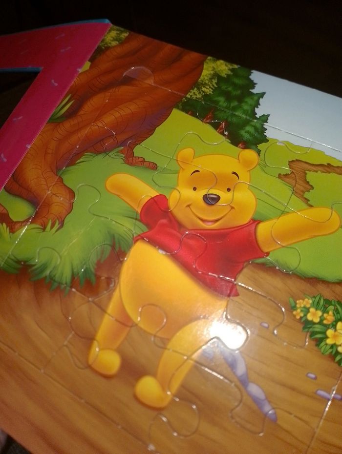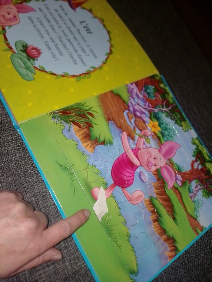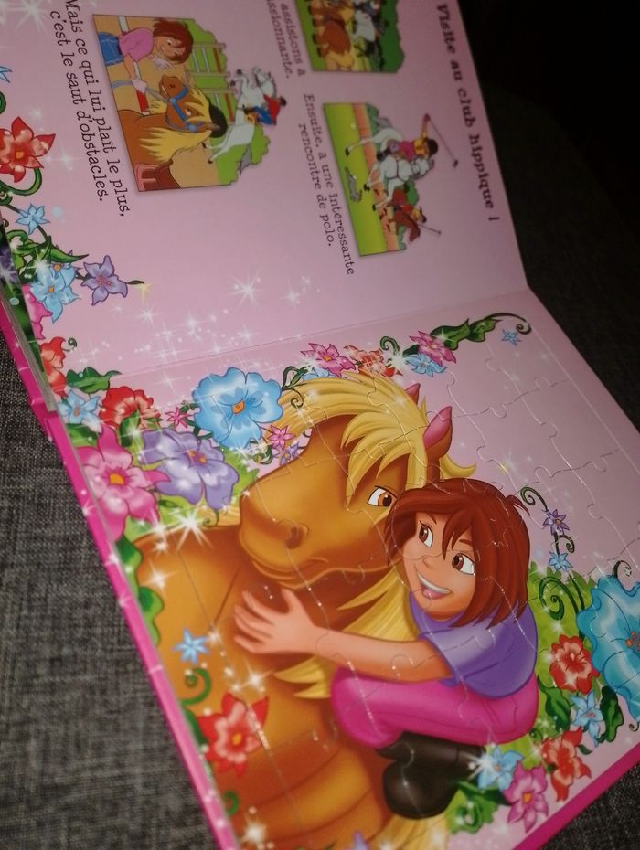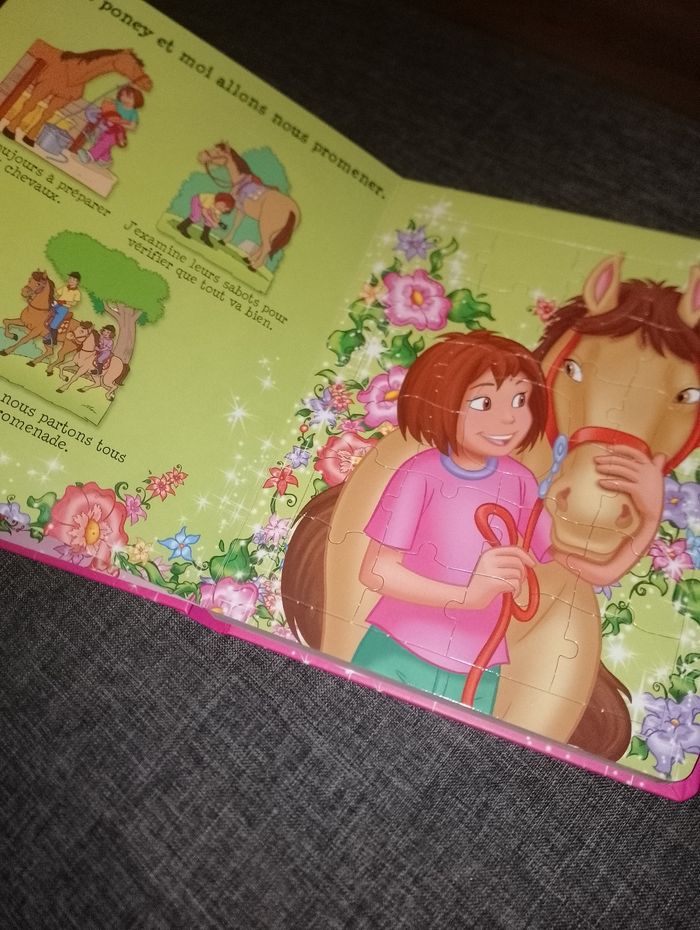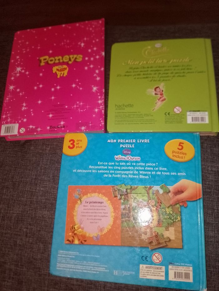 Livre puzzle Livre sur les Poney avec 8 puzzles neuf de 25 pièces coté gauche une petite histoire coté droit le puzzle 3ans et plus 18€ Livre de 5 puzzles Fée Clochette de 9 pièces très bon état 15€ Livre 5 puzzles (1 winnie, 1 bourriquet, 1 tigrou, 1 porcinet et 1 maman gourou avec bébé gourou) avec histoire à coté sur le thème des saisons de 12 pièces en bon état car 1 pièce 1 peu déchiré Et le Winnie en bon état 15€