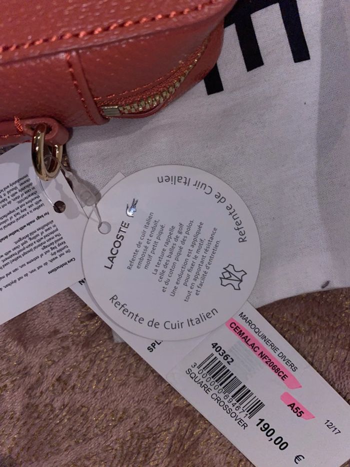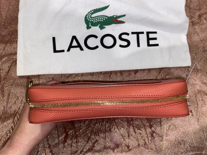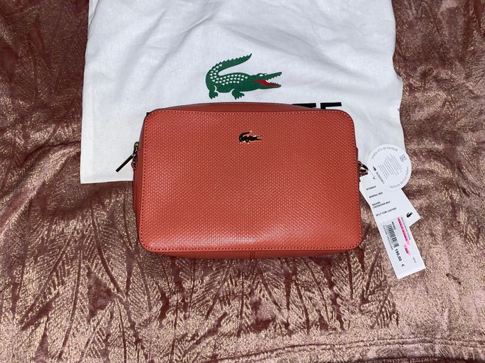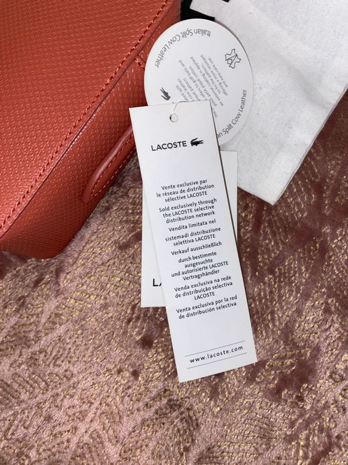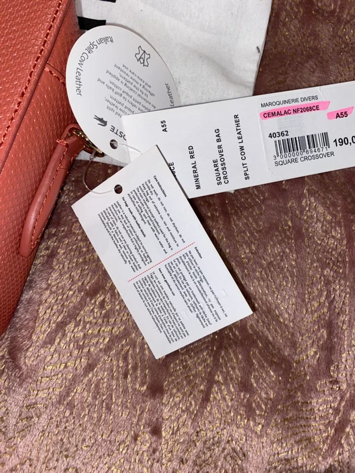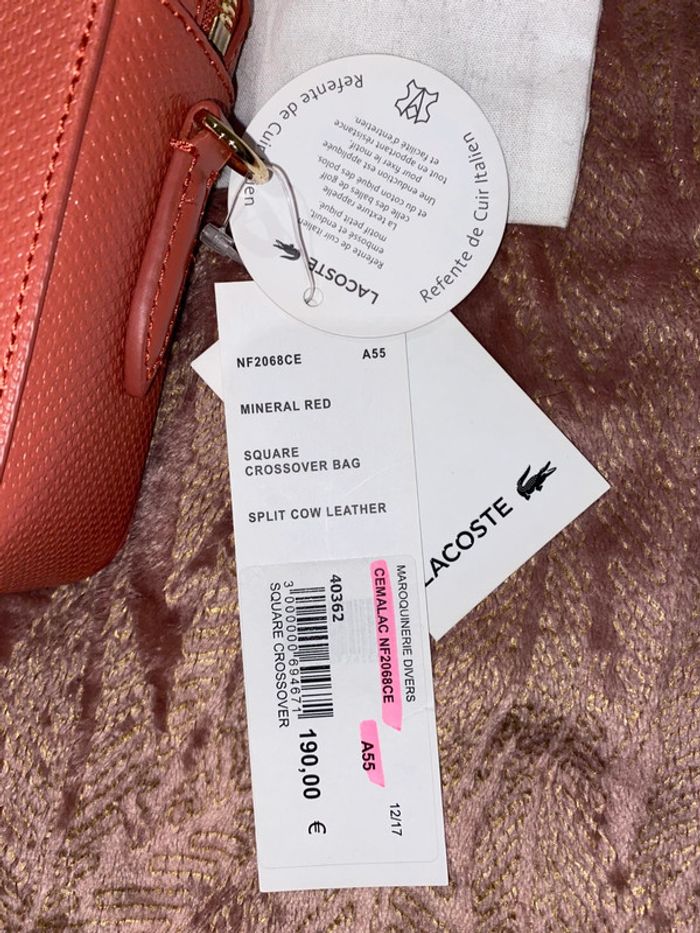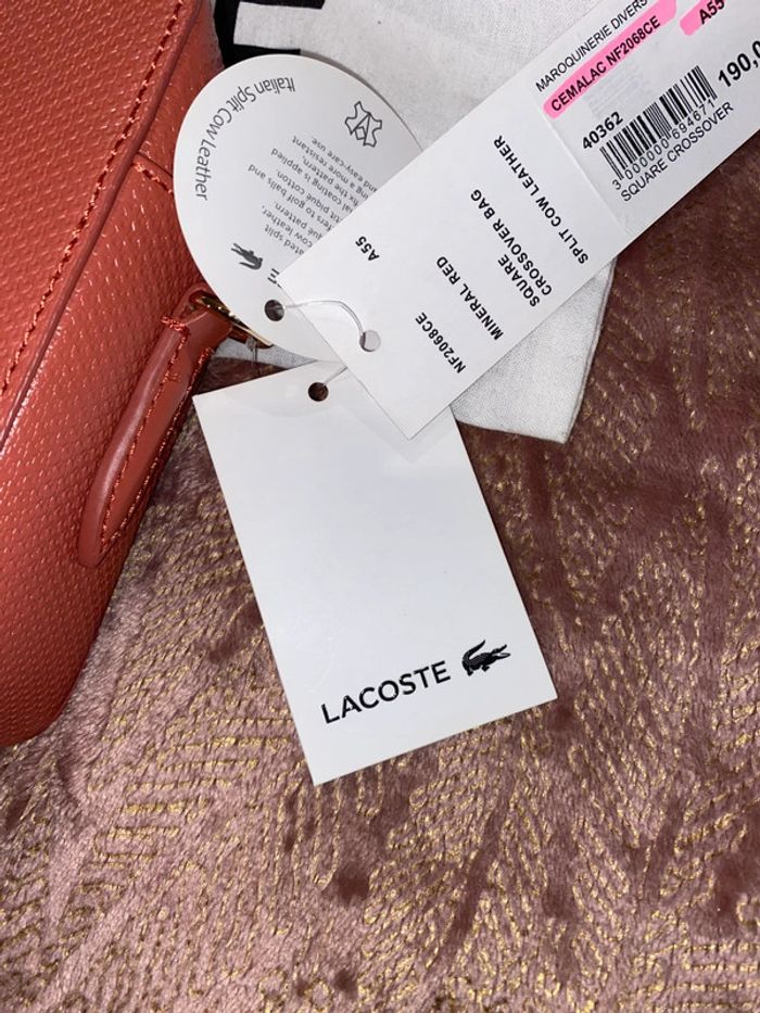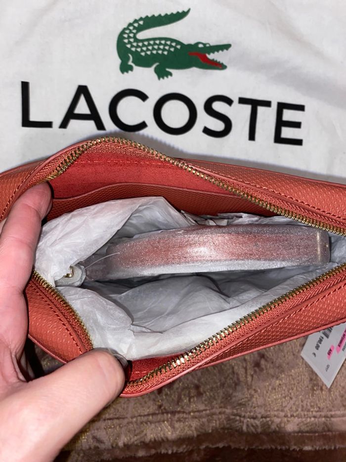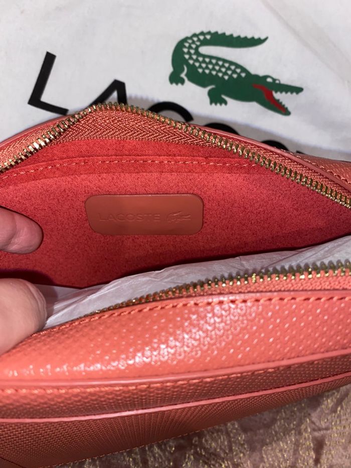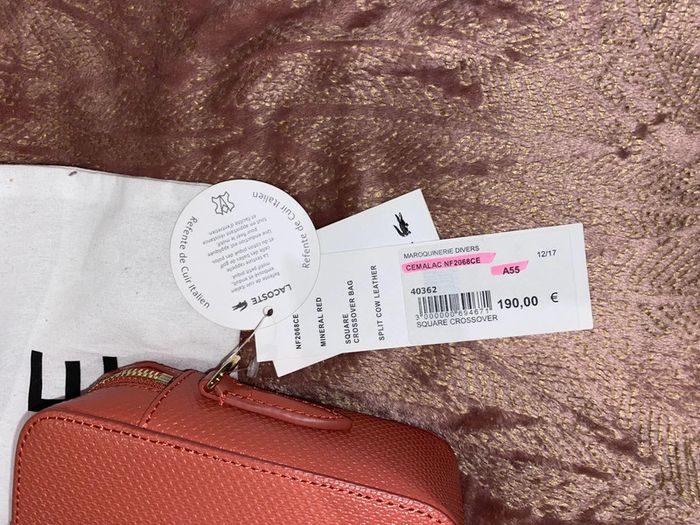 Sac Lacoste Modèle : Chantaco Couleur : minéral red ( corail ) Dimensions : 19 x 12 x 8 cm Neuf avec étiquettes. Authentique. Protections d’origine sur la bandoulière qui se trouve à l’intérieur du sac. Pochon d’origine de la marque . Prix d’achat comme indiqué sur l’étiquette 190€