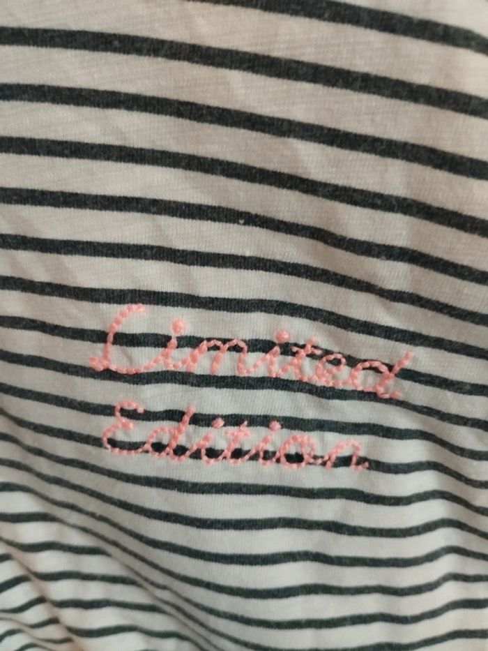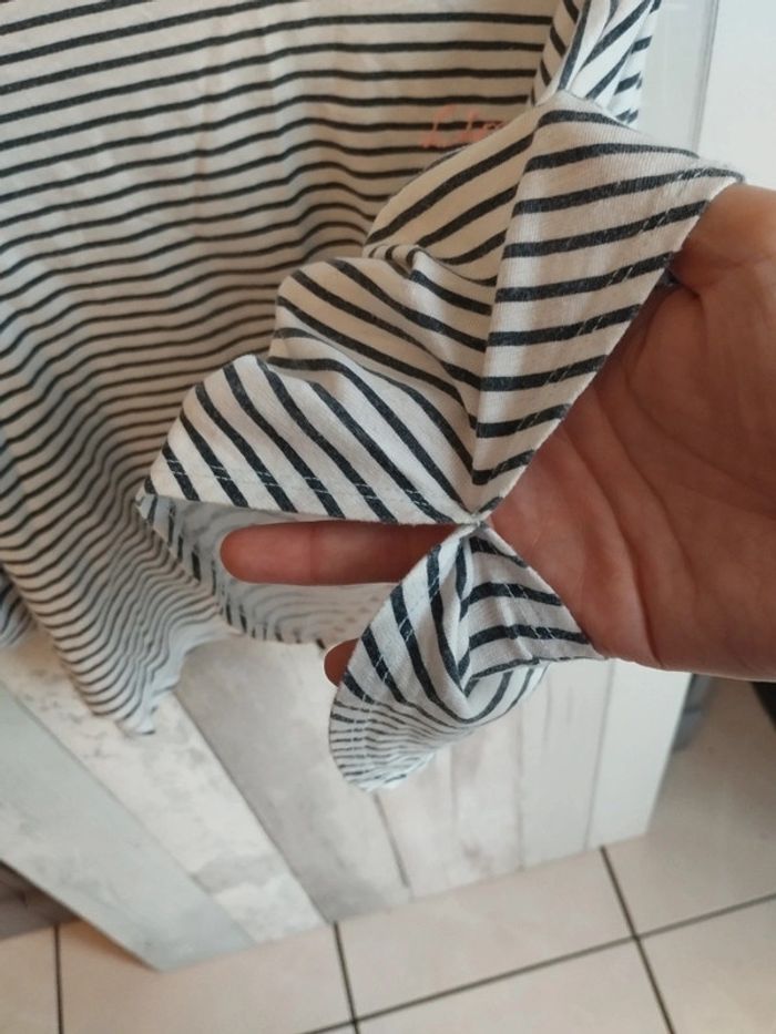 T-shirt marinière manches poncho, de chez Tape à l'oeil en taille 8 ans. Un petit noeud sur le bord des manches. Une écriture brodée en rose. #rosered16fille #8arosered16