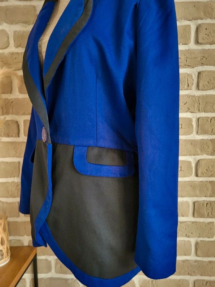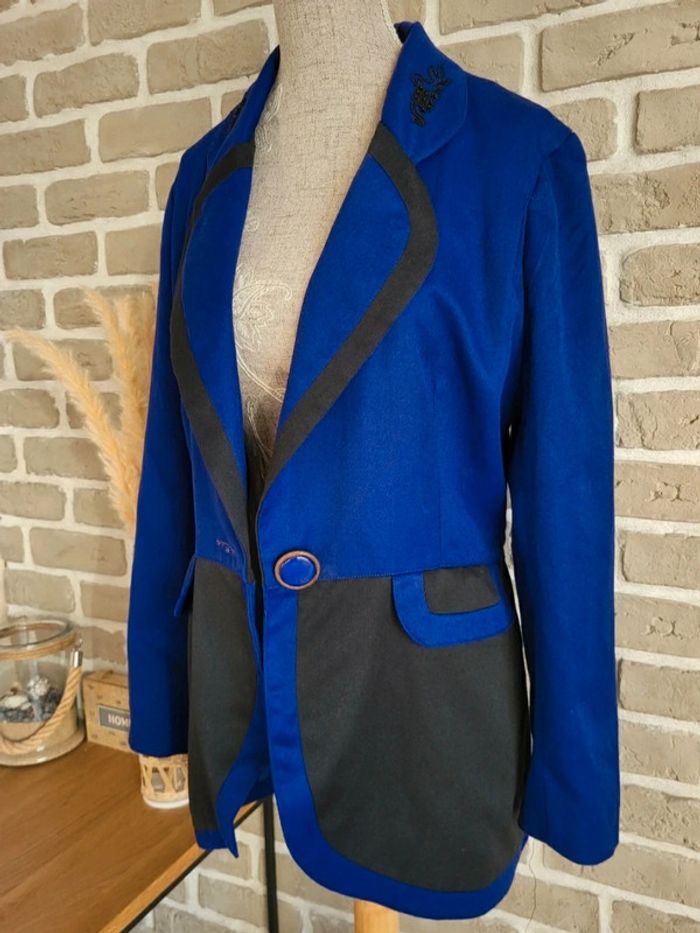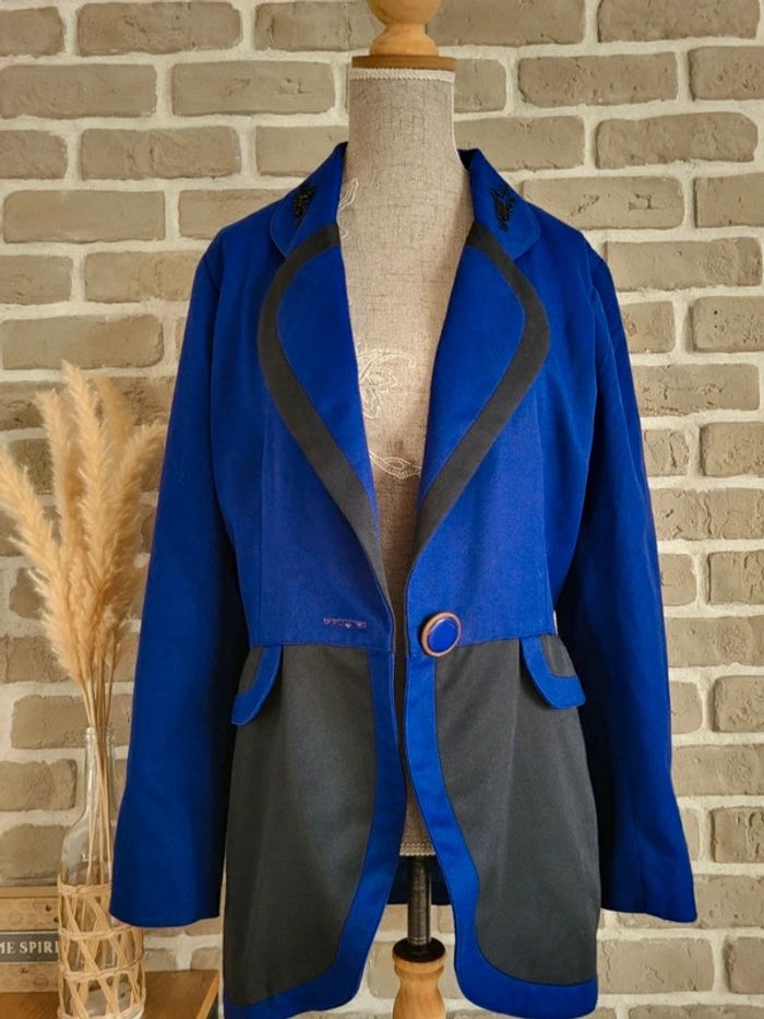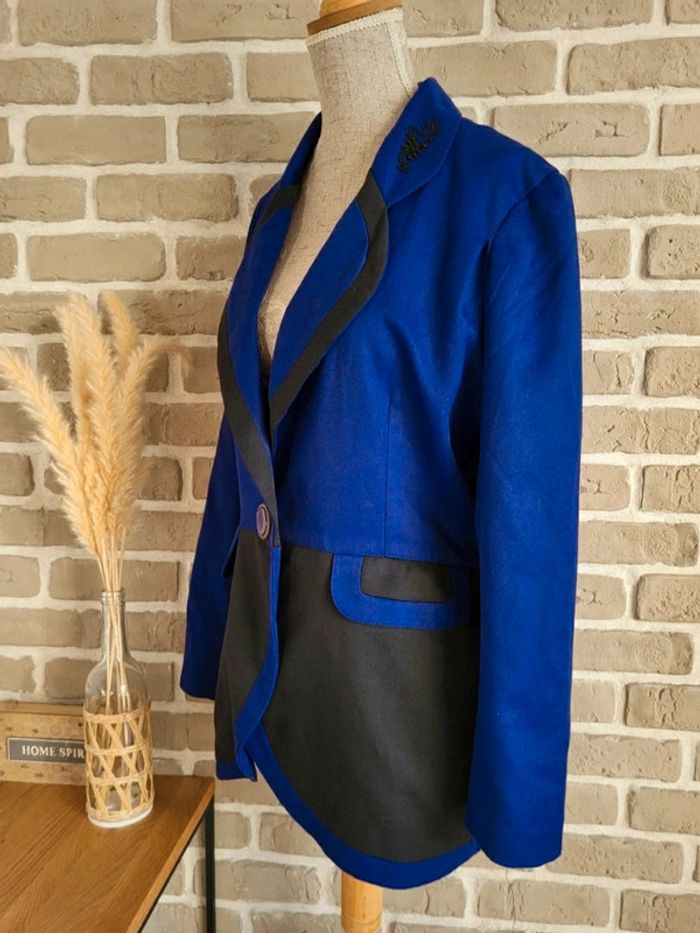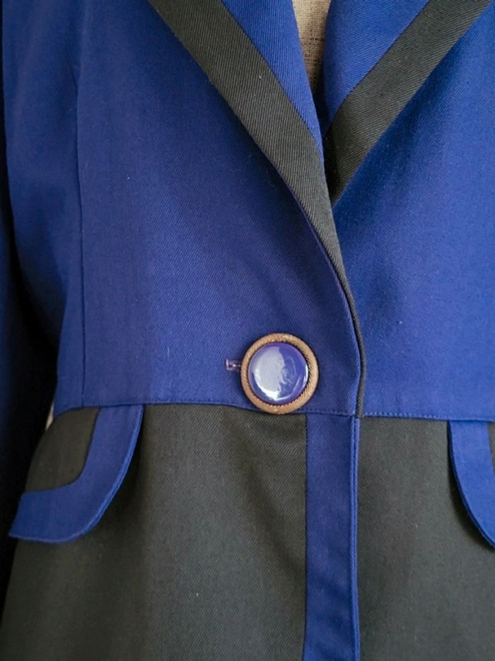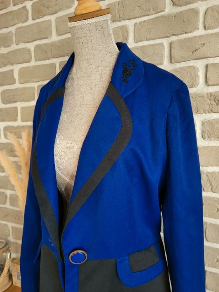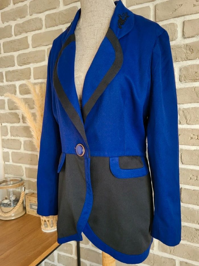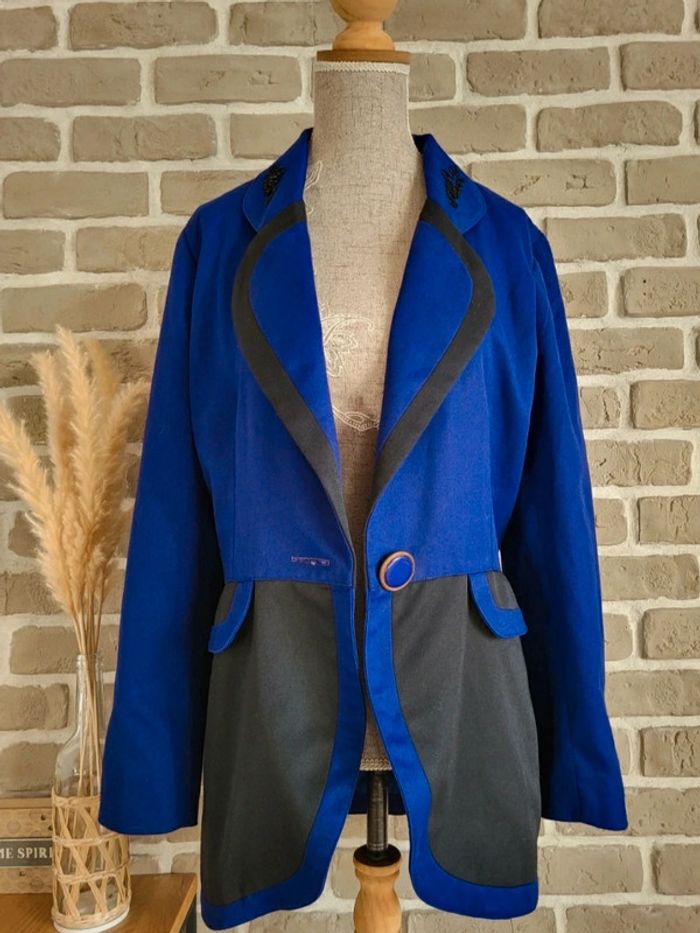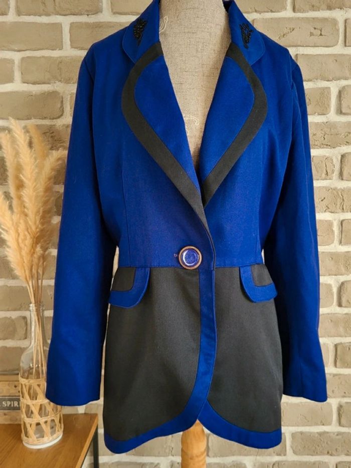 💝 Bénéficiez d'une réduction en créant lot dans mon dressing 🛍️ 🌸 Superbe veste blazer 100% vintage en bon état 🎀 Belle matière, toile bicolore bleu roi et noir 🩷 Style unique, coupe élégante et structurée pour un look rétro, chic ou original ! 🪷 Belles finitions : Broderies et perles au col, fermeture par un très joli bouton 2 vraies poches latérales 🔺 Très bon état à l'extérieur mais à l'intérieur, la doublure présente des petits trous (invisibles porté) 🍥 Taille 1 qui peut convenir à du S 36 ou du M 38 Largeur aux épaules : 36 cm Largeur aux aisselles : 48 cm Longueur : 71 cm