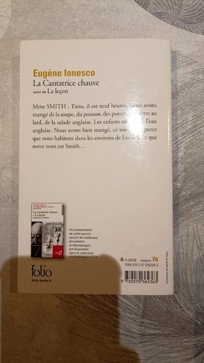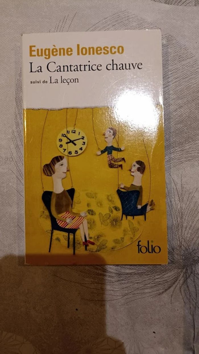 vends Livre de poche la cantatrice chauve Eugène Ionesco edition folio Gallimard très bon état La description «Mme Smith : Tiens, il est neuf heures. Nous avons mangé de la soupe, du poisson, des pommes de terre au lard, de la salade anglaise. Les enfants ont bu de l'eau anglaise. Nous avons bien mangé ce soir. C'est parce que nous habitons dans les environs de Londres et que notre nom est Smith...» #sylvaine88livres #cantatrice #chauve #ionesco #gallimard #folio N'hésitez pas à regarder l'ensemble de mon dressing je fais -20% sur les lots