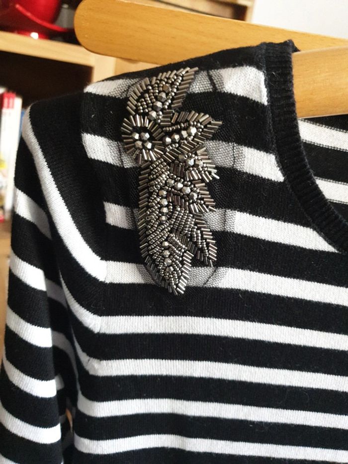 Pull léger en coton / nylon/ modal. Très joli ornement en perles couleur bronze à l'épaule droite. Petites fentes sur les côtés