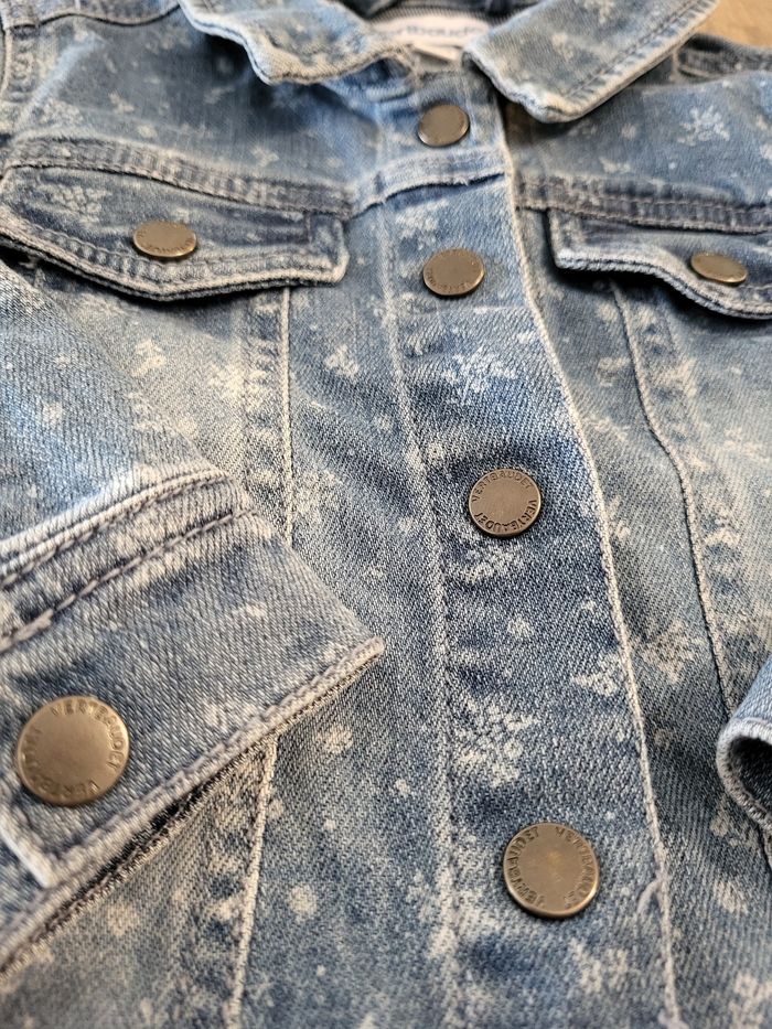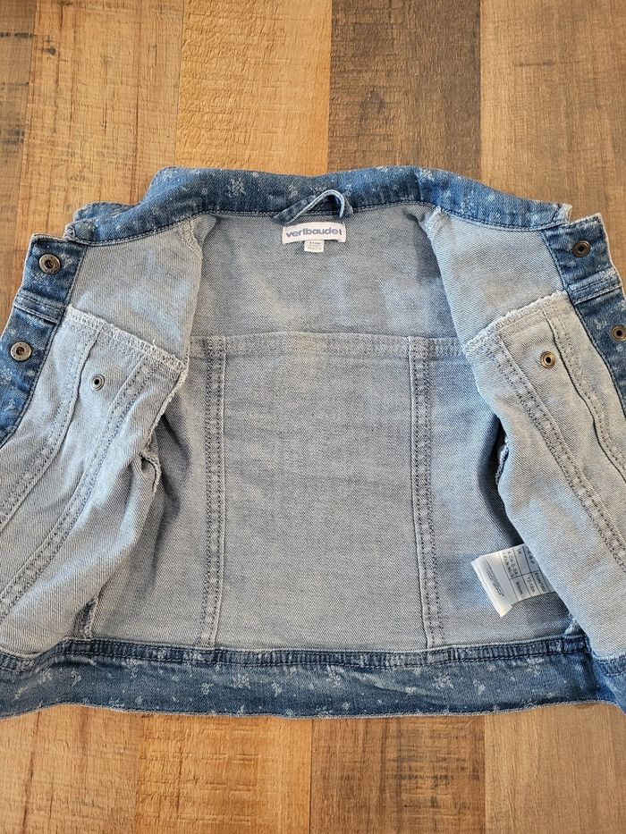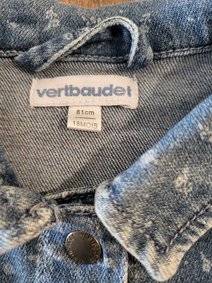Veste en jean effet un peu délavé, s'attache à pression, très bon état. 18 mois.
