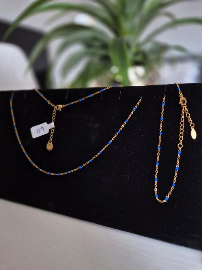 Parure de 2 bijoux : 1 collier et 1 bracelet acier inoxydable or dorée NEUFS perles bleu
