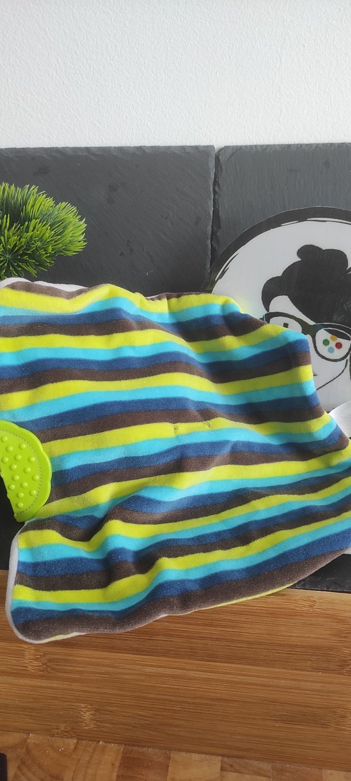 Doudou plat Ours grelot gris marron rayé bleu vert dentition orchestra coeur - photo numéro 1