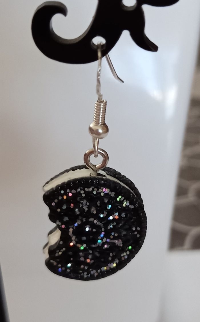 Tige en alliage coloris argenté . Motif petit gâteau oreo. ( avec paillettes multicolores). Hauteur : 4 cms. Diamètre : 1,8 cms. Boucles neuves sous blister. N'hésitez pas à regarder mes autres ventes. Envoi rapide et soigné.